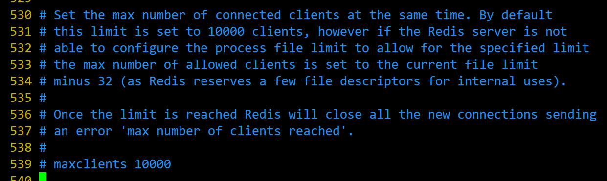 maxclients: 设置redis同时可以与多少个客户端进行连接。默认情况下为10000个客户端。如果达到了此限制,redis则会拒绝新的连接请求,并且向这些连接请求方发出“max number of clients reached”以作回应。