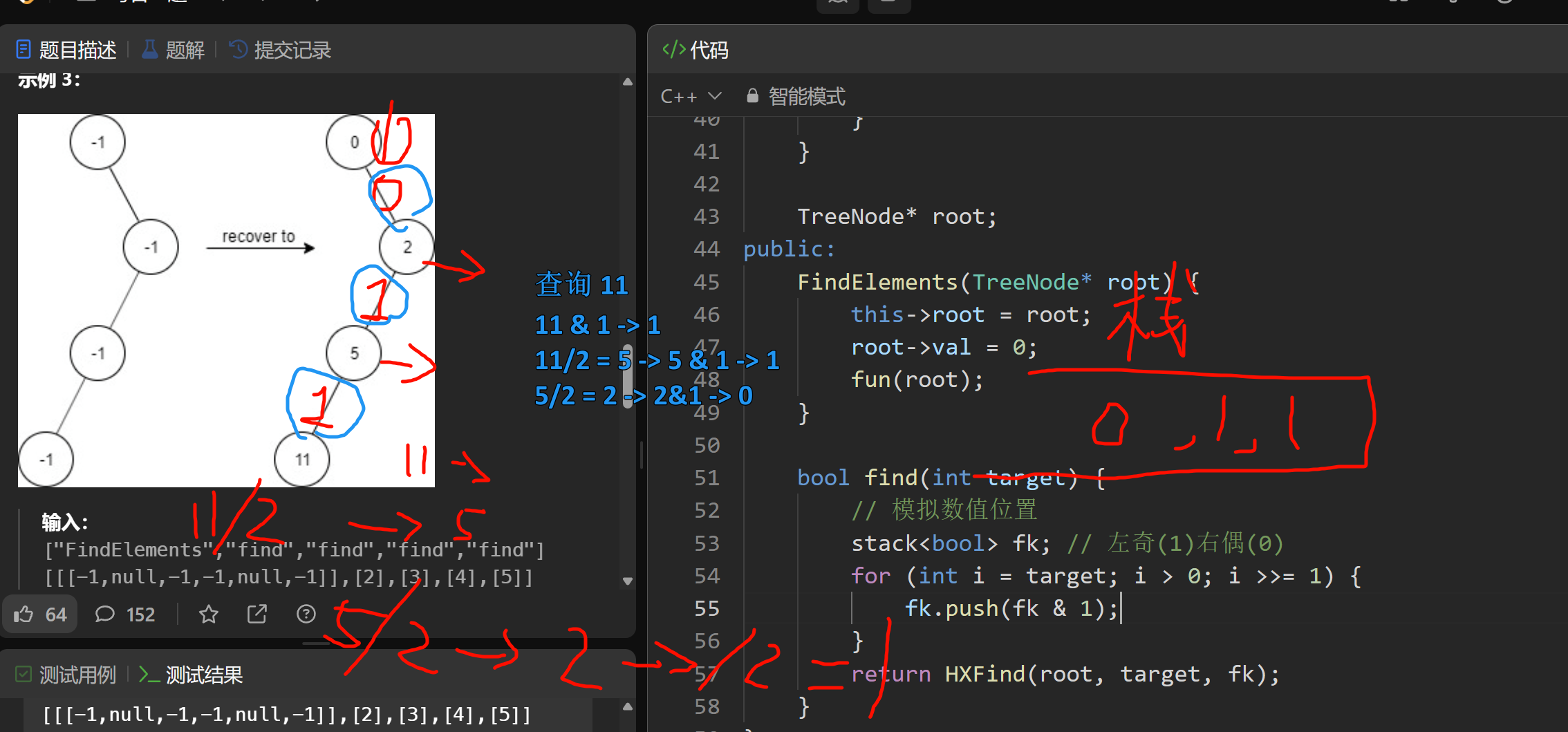 FindElements(TreeNode* root) 用受污染的二叉树初始化对象,你需要先把它还原。 bool find(int target) 判断目标值 target 是否存在于还原后的二叉树中并返回结果。