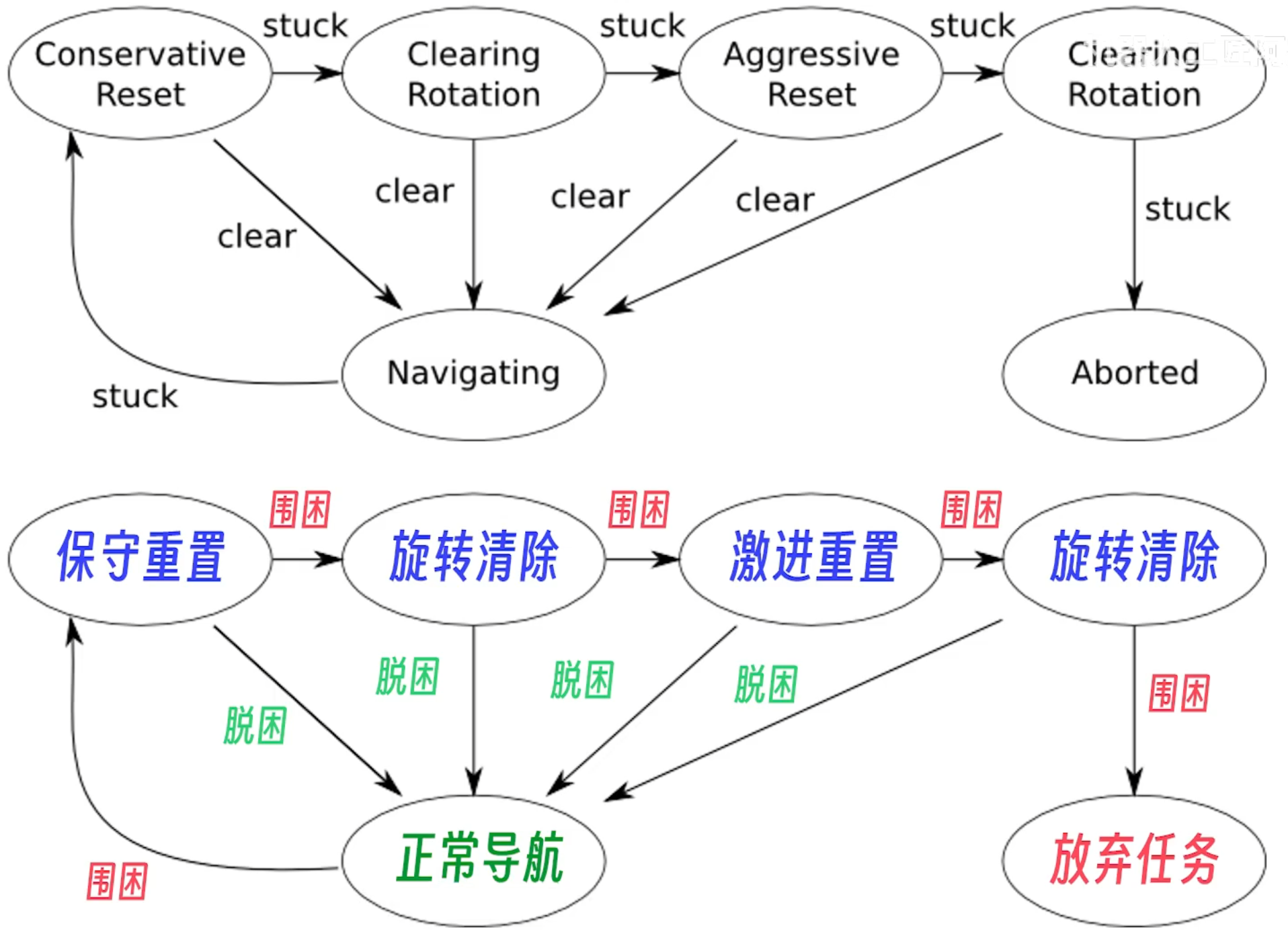 简单地说就是如果你的雷达不是360度扫描的, 或者某些情况看不见后方, 导致没有更新后面的状态; 而此时前方的路被挡住了, 就会尝试清除地图重新规划路线/旋转重新局部建图..