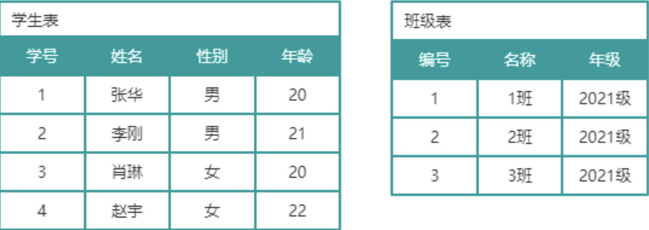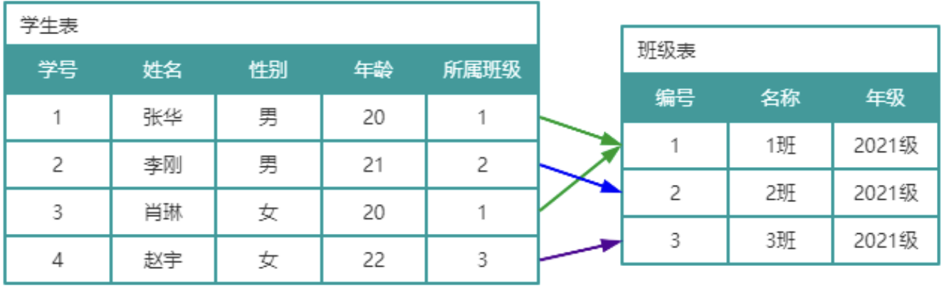 如图所示,此时学生表和班级表并没有任何关系,然而实际上学生和班级是存在归属关系。可以在学生表中添加一个字段,表名该学生所属班级,该字段值使用的是班级表中的主键,在学生表中称之为外键。这样学生表中的所属班级(外键)与班级表中的编号(主键)就产生关联关系,这种关联关系称为主外键关联关系。