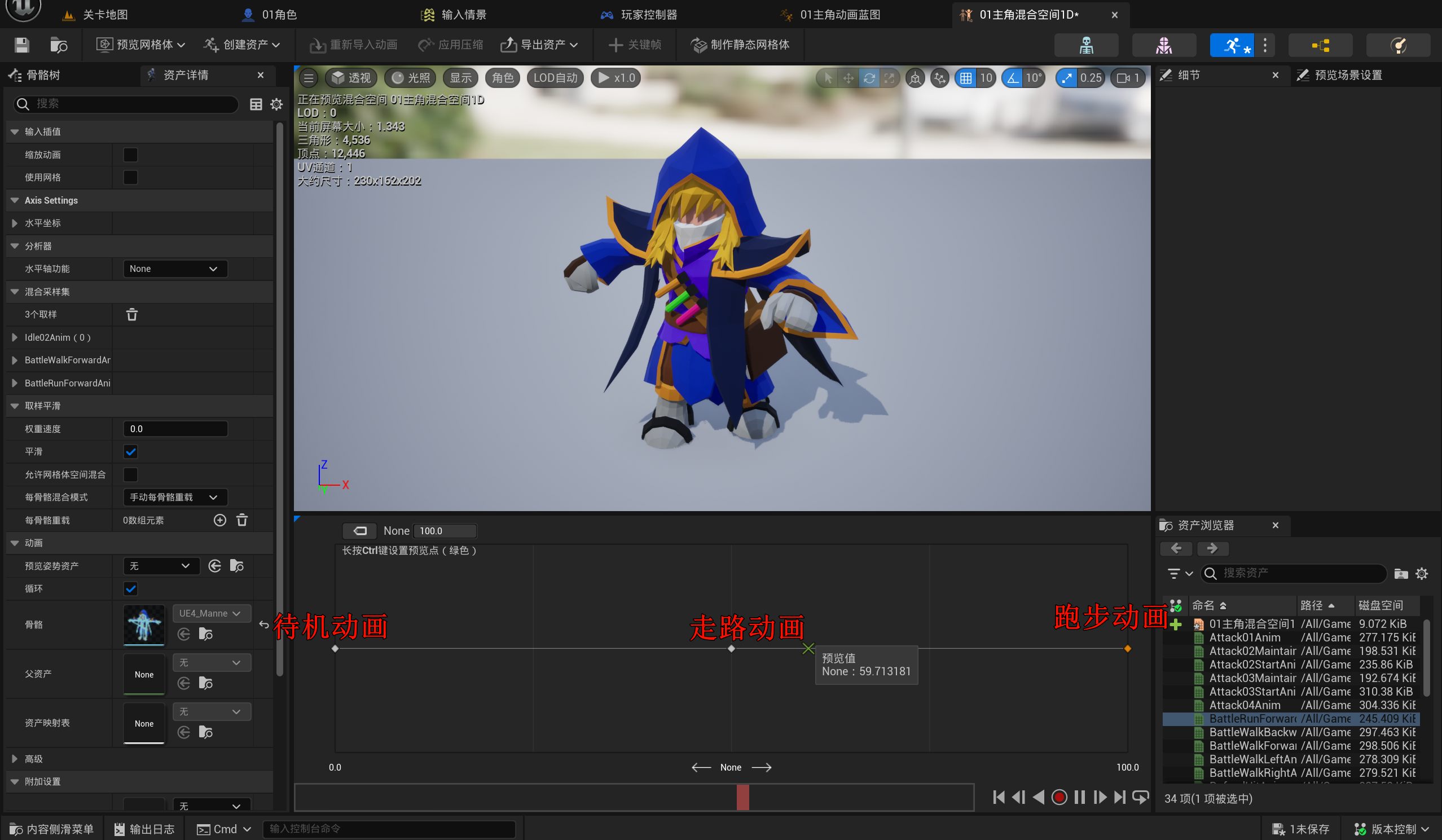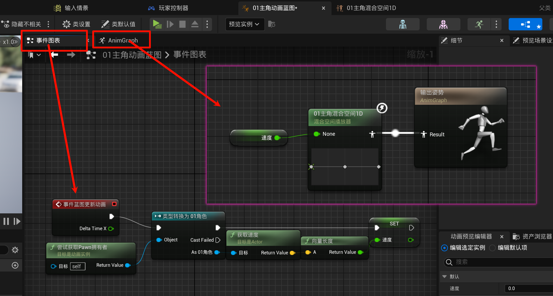 游戏引擎虚幻引擎蓝图第二章丶动画蓝图,混合空间本页总览2.6 动画蓝图,混合空间 2.6.1 动画蓝图 & 混合空间 新建如下: 混合空间如下编写: 动画蓝图如下编写: 最后去设置一下01主角的动画为这个动画蓝图即可.