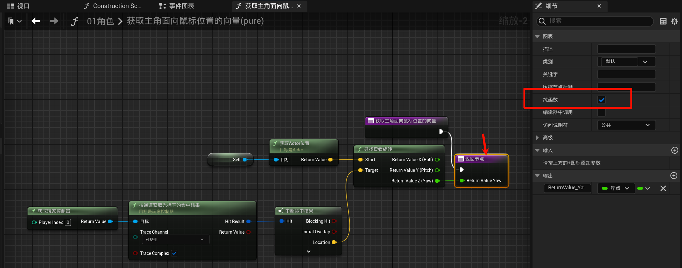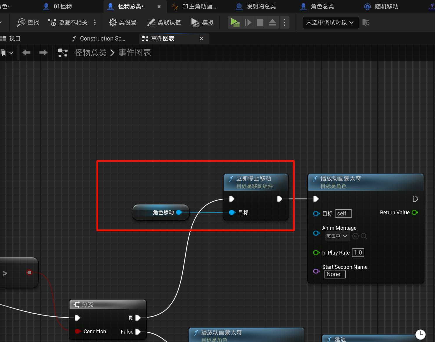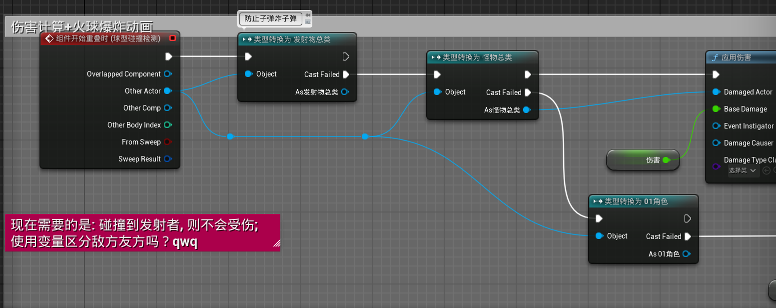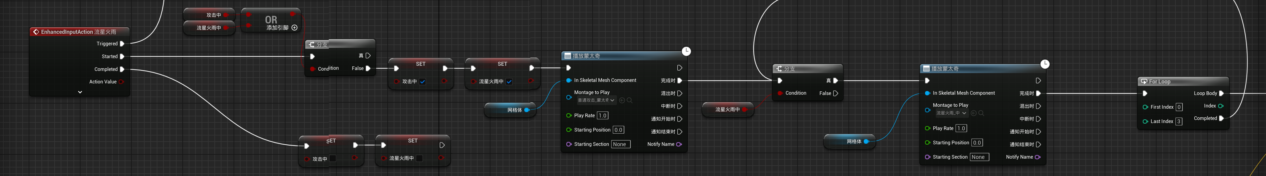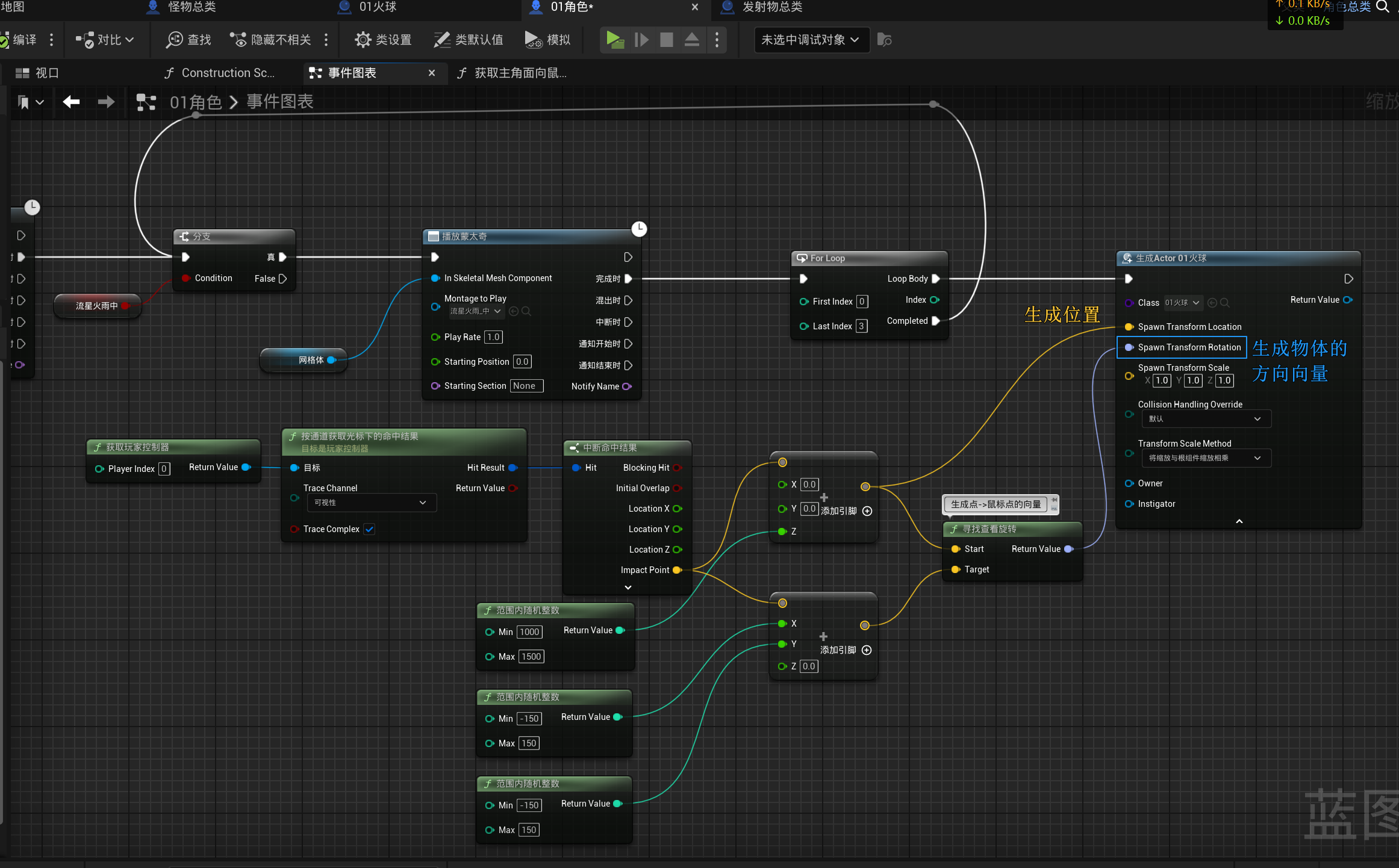 游戏引擎虚幻引擎蓝图第二章丶流星火雨,引导施法技能制作、随机数本页总览2.15 流星火雨,引导施法技能制作、随机数 2.15.1 优化: 让怪物受到攻击会僵直 先停止再播放动画. 2.15.2 引导施法技能的动画 先搞一个右键事件... 然后搞一个正在释放动画的蒙太奇... 然后就是写按住右键就会持续释放的动画: 使用一个布尔变量, 表示是否处于按住状态(右键弹起就将它设置为false), 然后循环播放攻击中的动画(可能看着有点别扭): (顺便写了实时指向鼠标位置 (用到了自定义的纯函数)) 2.15.3 创建火球类似陨石落地的逻辑 子弹逻辑也改一下, 让它碰到地面也会爆炸(记得启用地图的生成重叠事件)