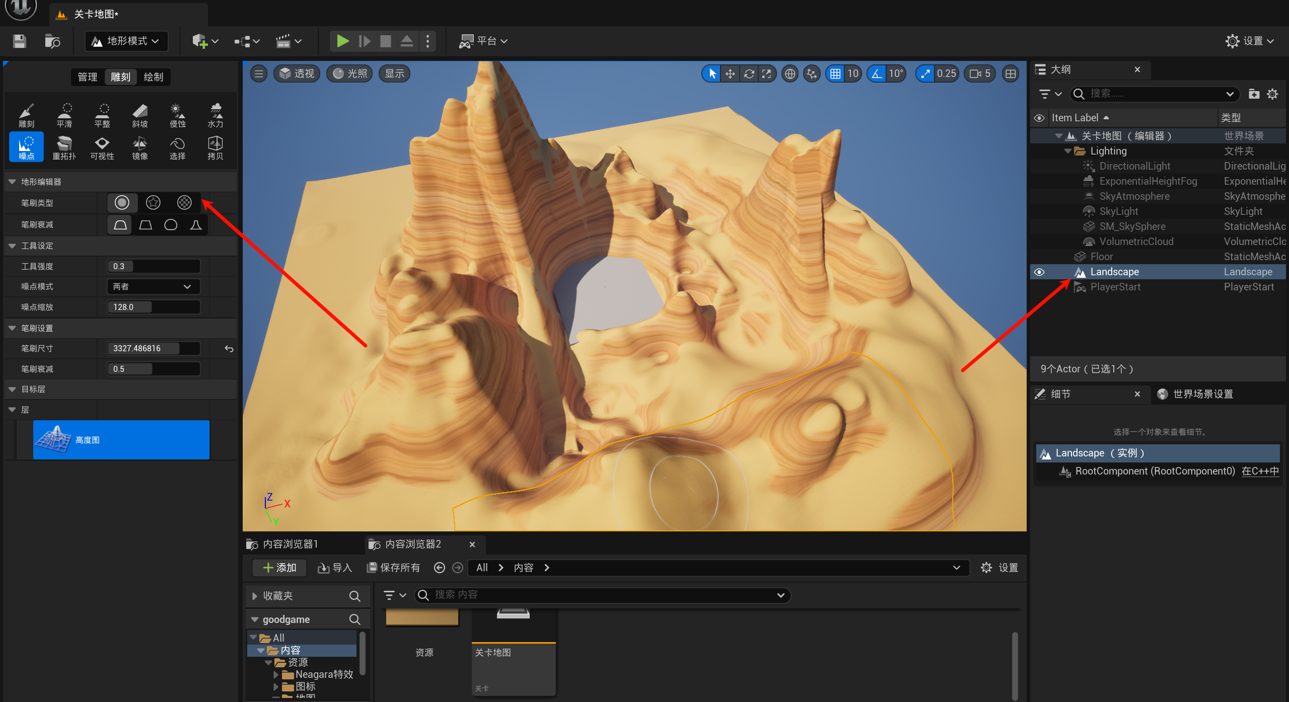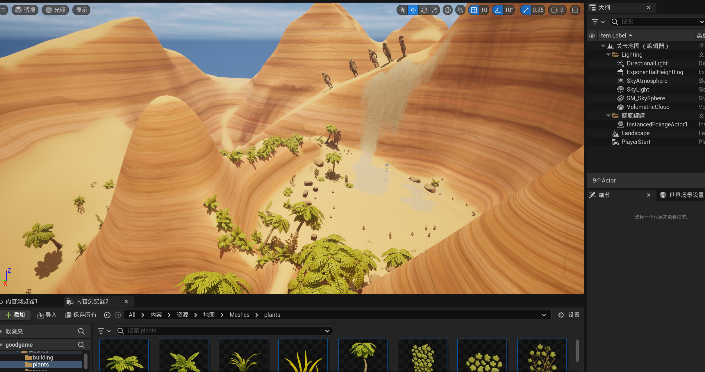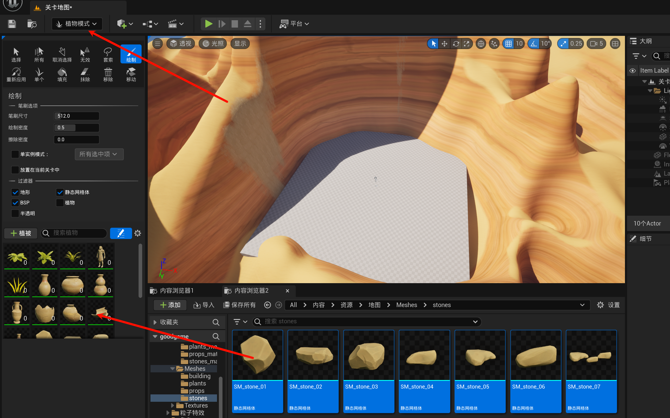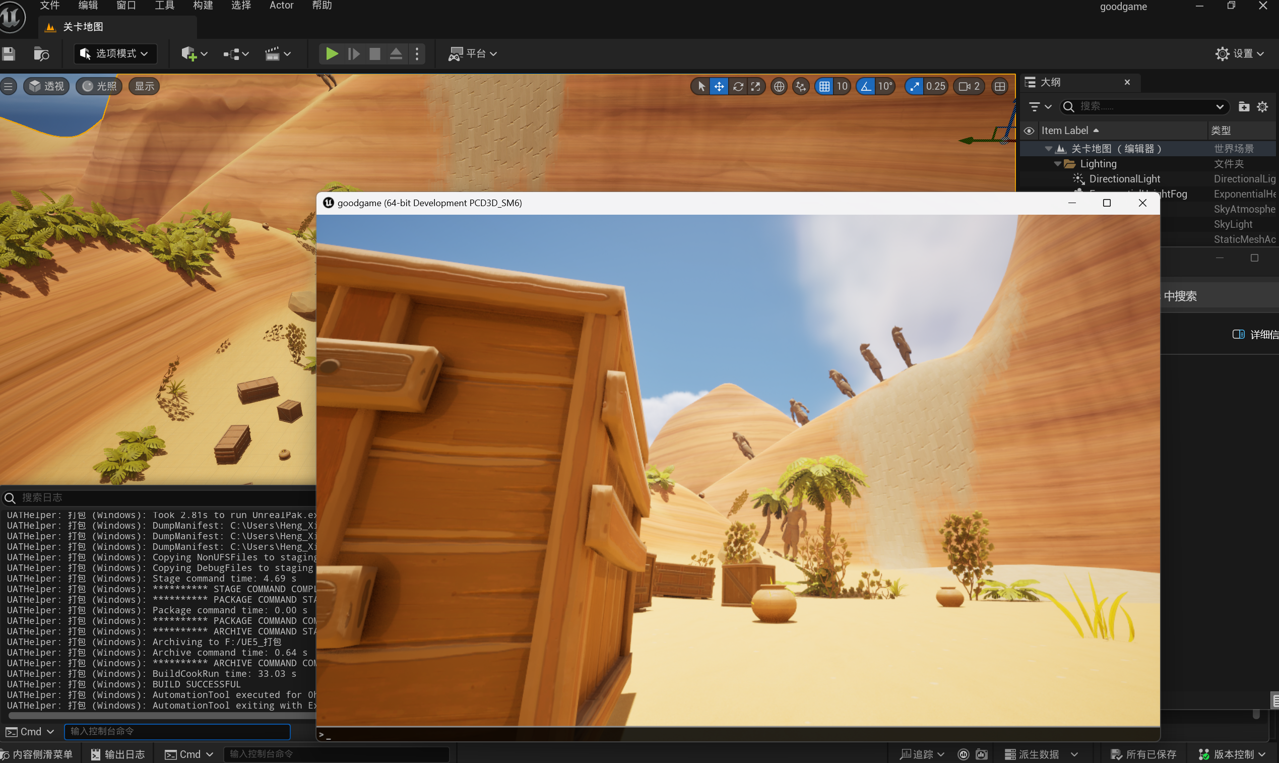 游戏引擎虚幻引擎蓝图第二章丶简单场景绘制、打包验证资源本页总览2.3 简单场景绘制、打包验证资源 2.3.1 复制地形 复制[地图]资源的地形到[关卡地图], 然后自己玩一玩: 把瓶瓶罐罐当做植物, 然后玩一玩: 2.3.2 打包验证资源 项目最好每隔一段时间就打包一次, 你不知道什么时候就开始报错了, 到时候一打包一大堆报错就舒服了...