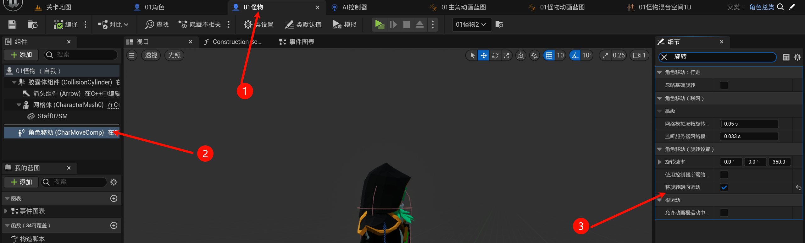 实现怪物移动动画, 同复制蓝图(动画蓝图和混合空间, 把目标改为怪物的, 然后混合空间的速度改一下和怪物的匹配就OK)