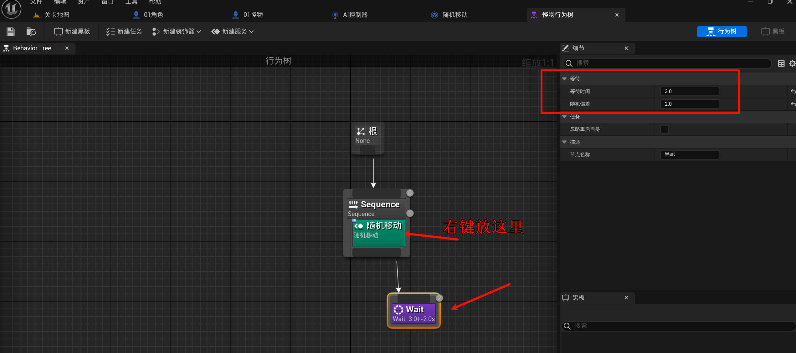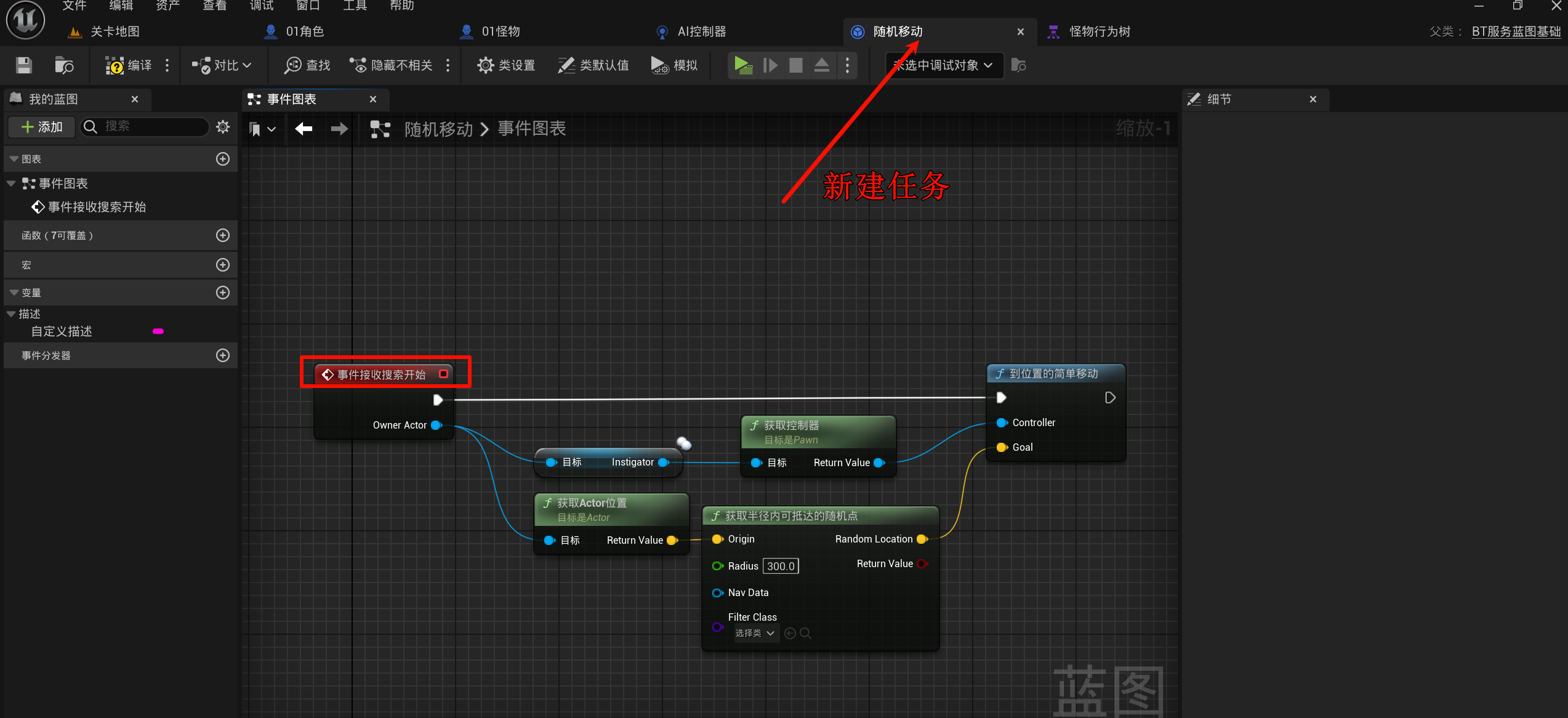 不知道是UE5.4的问题还是我的问题, 不能像up一样搞, 甚至连线也不是用那个构建成功消息的蓝图...(而且, 明明是新建的任务, 为什么右键不能新建节点, 而且是需要在服务那里才可以使用这个随机移动??!)