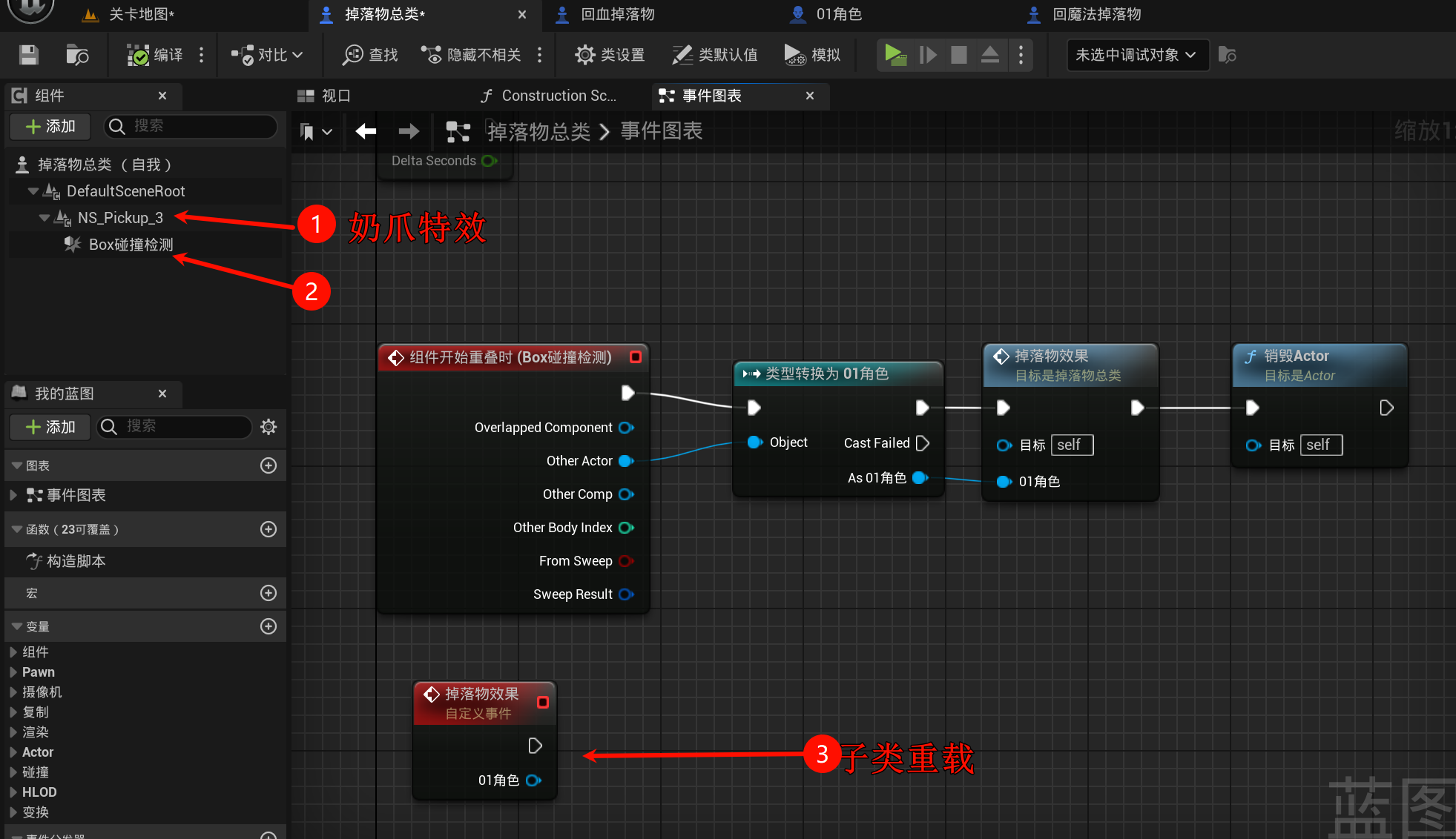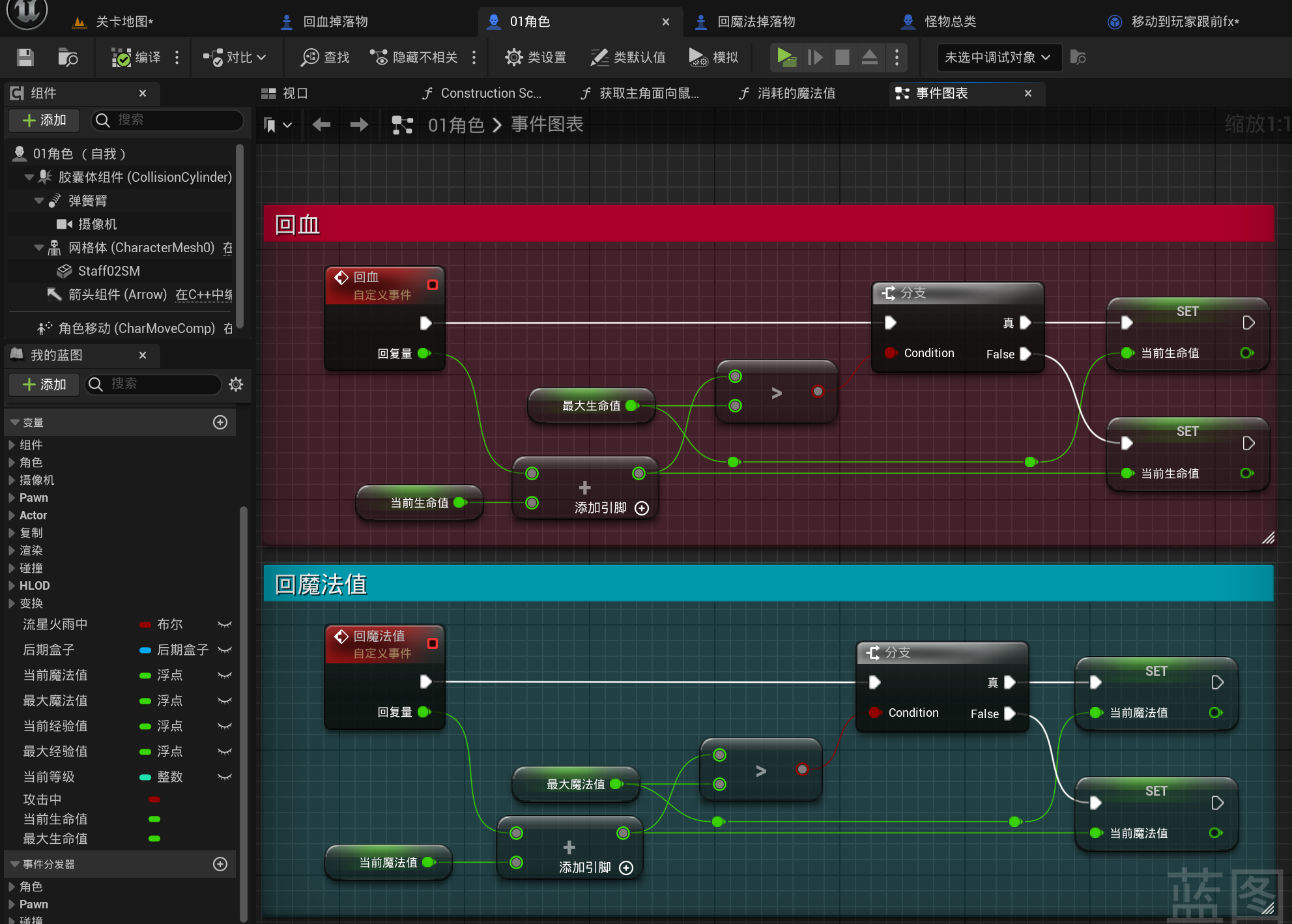 回血/蓝的逻辑写在角色里面, 然后掉落物的子类重载事件后调用角色的逻辑即可: