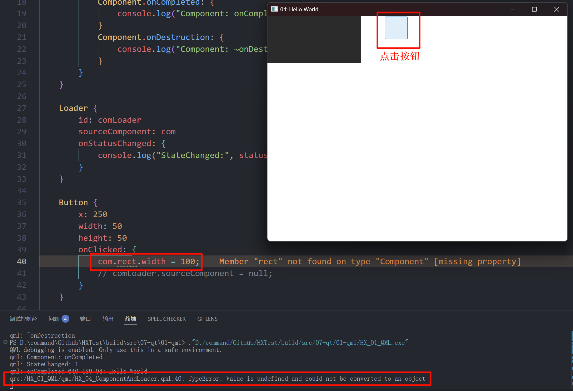 我们发现, 像上图那样修改, 是会直接报错的, 因为QML似乎找不到这个元素.