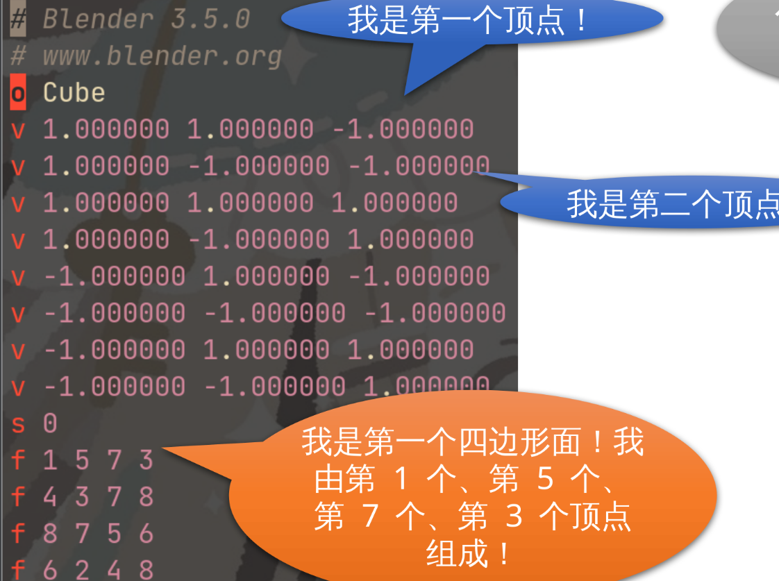 v 指令, 他代表一个顶点, 后面跟着的数据是用空格分割的三个浮点数, 分别代表着顶点的 x、y、z 坐标。此外还有 o 指令用于指定当前对象名称, 以 # 开头行的是可选的注释, 注释不会被读取和解析。