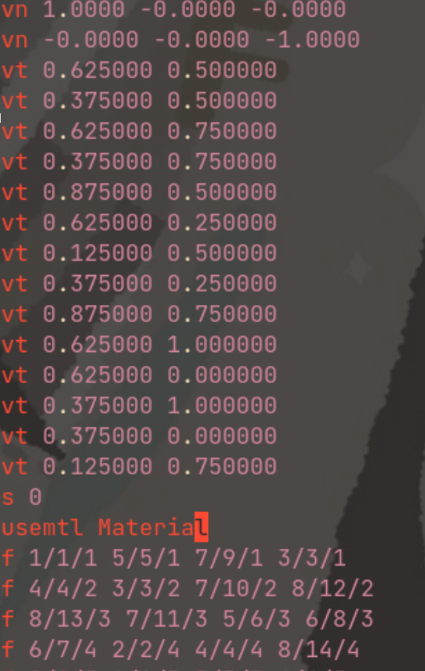 OBJ 文件包含很多行, 每一行都包含一个 指令。指令由英文字母开始, 后面跟着几个数字或字符串作为数据, 典型的是