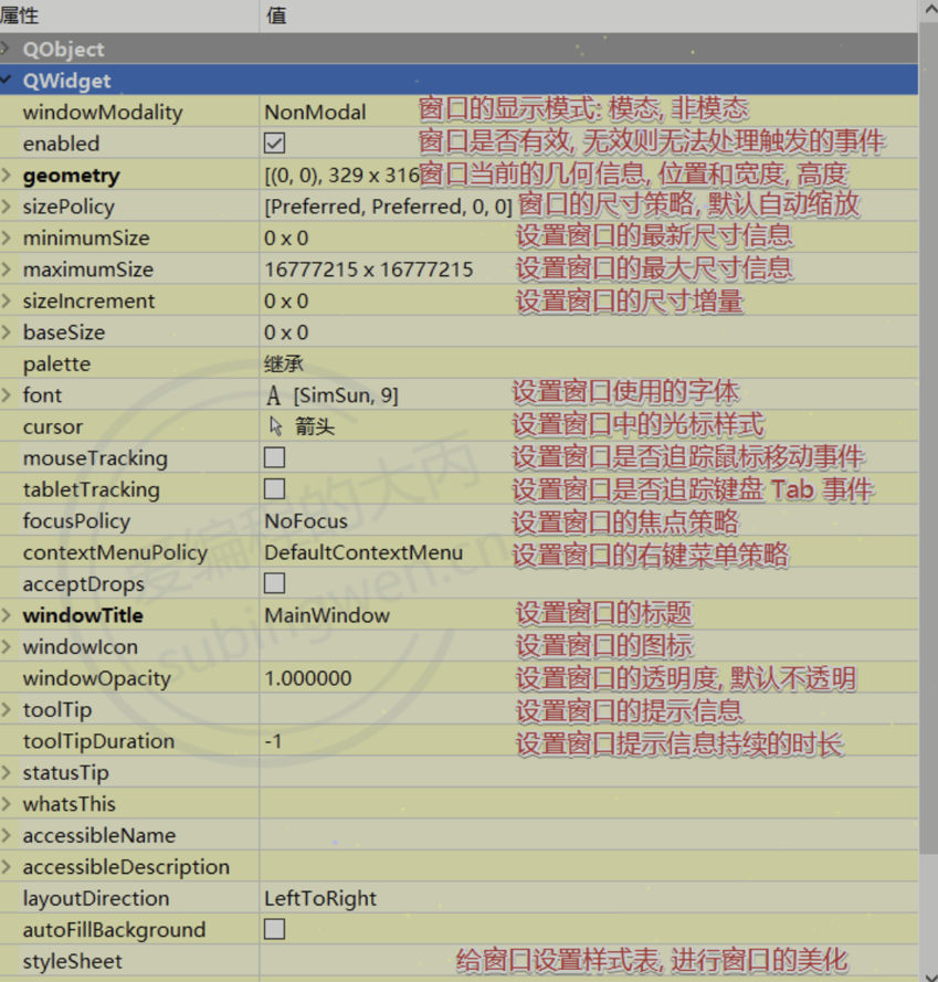 在这里给大家介绍一下关于这个类的一些属性,因为这个类是所有窗口类的基类,因此相关属性比较多,详细讲解可以观看视频 -> https://www.bilibili.com/video/BV1Ai4y1c7Di/?p=2