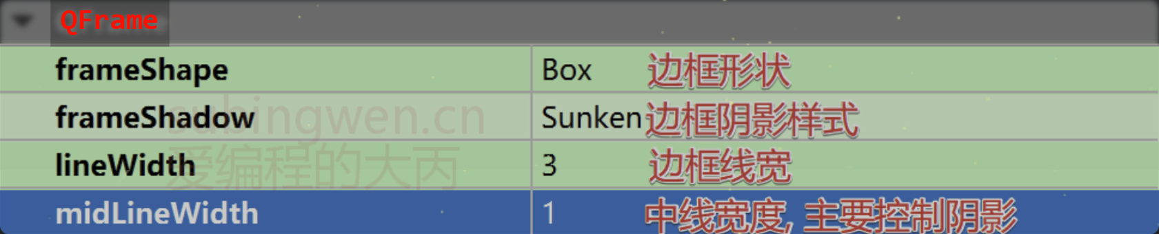 QFrame就是一个升级版的QWidget, 它继承了QWidget的属性, 并且做了拓展, 这种类型的容器窗口可以提供边框, 并且可以设置边框的样式、宽度以及边框的阴影。