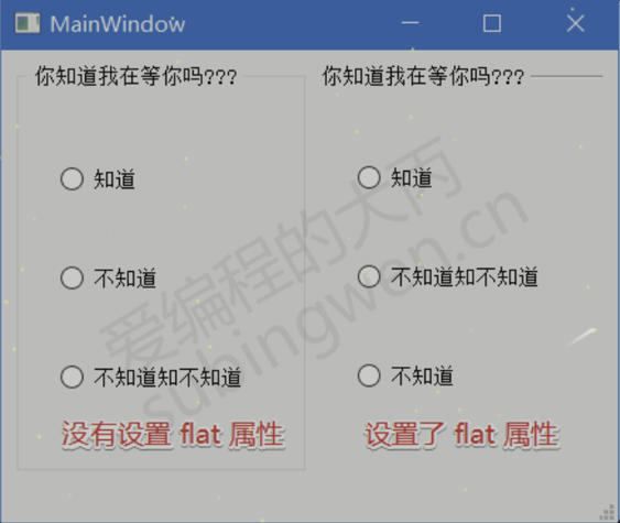 组框中的flat属性没有对应的API函数, 只能在属性窗口中设置, 它控制的是窗口边框的绘制方式, 如果打开该属性, 组框的边框就消失了, 效果如下: