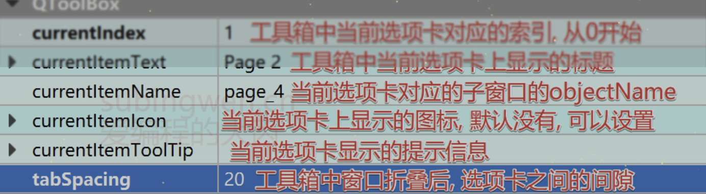 容器类型的控件其大多数情况下都是直接在属性窗口中直接设置, 因为这些属性设置完毕之后, 就无需再做修改了, 程序运行过程中无需做任何变化。下图为大家标注了每个属性对应的功能。