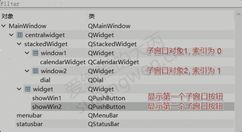 QStackedWidget栈类型窗口, 在这种类型的窗口中可以存储多个子窗口, 但是只有其中某一个可以被显示出来, 至于是哪个子窗口被显示, 需要在程序中进行控制,在这种类型的窗口中没有直接切换子窗口的按钮或者标签。