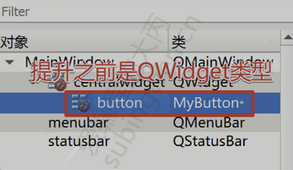 由于Qt的UI工具箱中提供的都是标准控件,自定义的控件是不能直接拖拽到UI窗口中的,这时我们需要先看一下自定义控件的基类类型: 上面自定义的 MyButton 的基类是 QWidget 类型,因此需要往窗口中拖拽一个QWidget类型的标准控件,然后在这个标准控件上鼠标右键:
