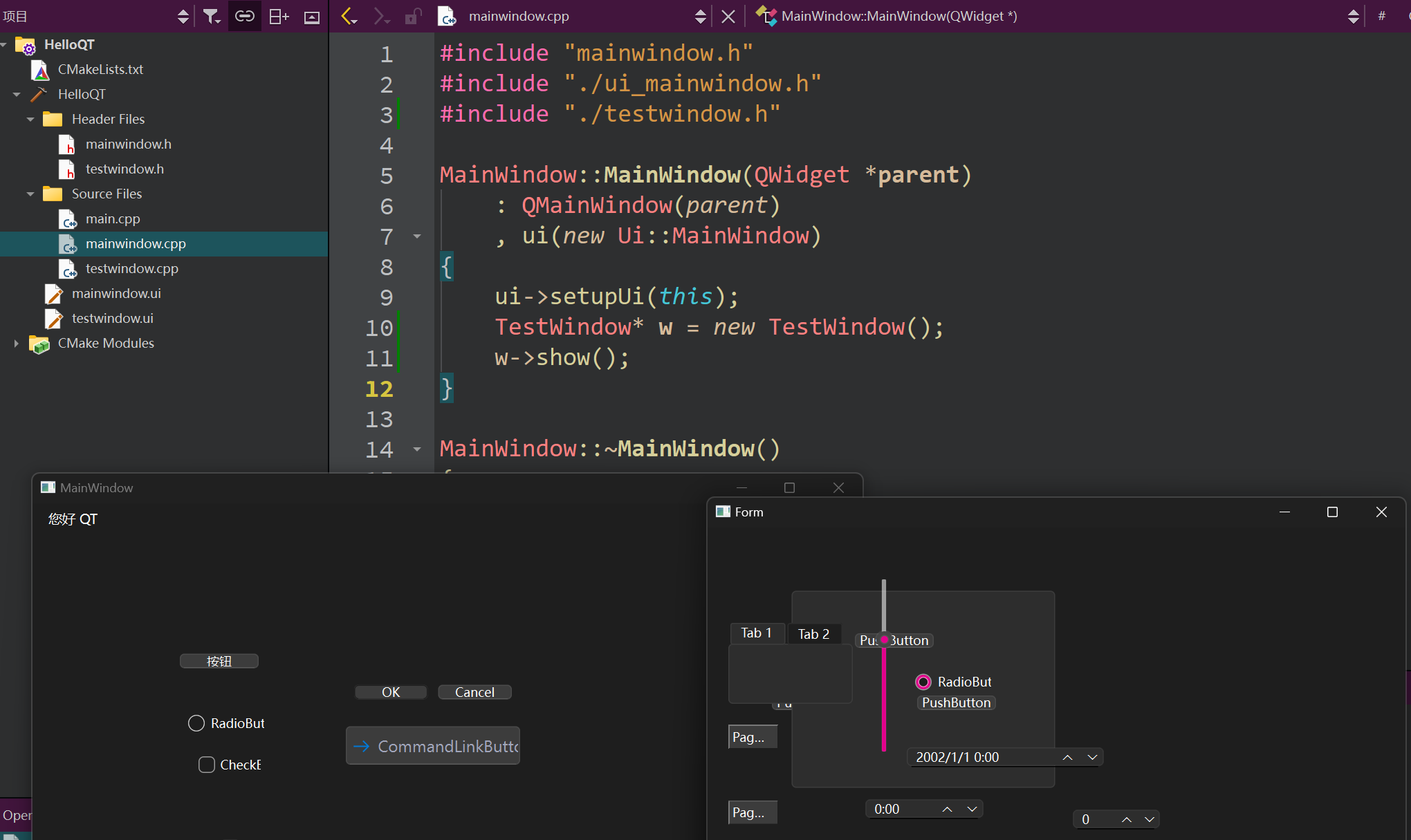 如上代码, 如果我们直接这样, 创建出来的是两个独立的窗口, TestWindow窗口必需要->show才可以显示; 并且和窗口MainWindo无关.