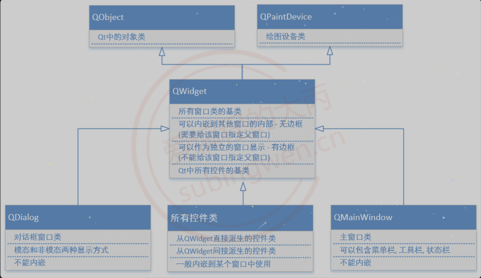 QWidget类是所有窗口类的父类(控件类是也属于窗口类), 并且QWidget类的父类的QObject, 也就意味着所有的窗口类对象只要指定了父对象, 都可以实现内存资源的自动回收。