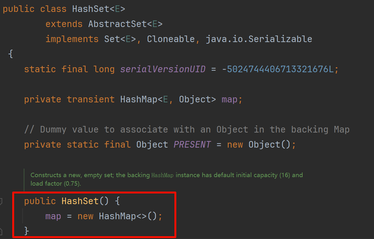 此类实现Set接口,该接口由哈希表(实际上是HashMap实例)支持。它不保证集合的迭代顺序。特别是,它不能保证顺序会随着时间的推移保持恒定。此类允许使用null元素。
