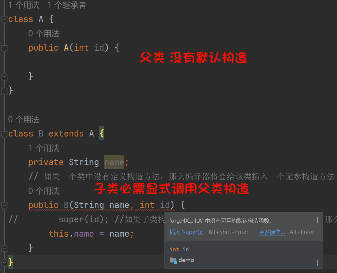 // 如果父类中定义了带参构造,并且没有定义无参构造,那么必须在子类的构造方法中显式的调用父类的带参构造