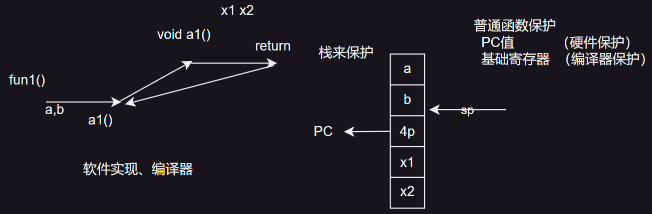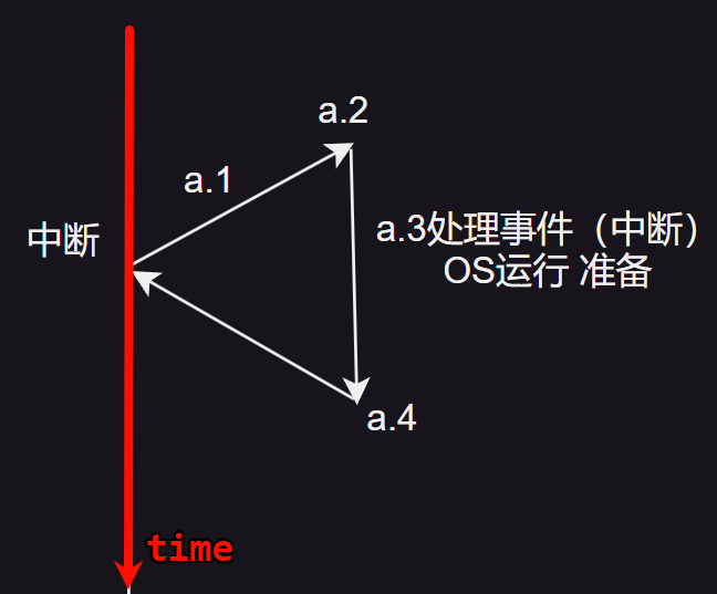 a.1 保护现场 PC值 (CPU保护) PSW寄存器(OS保护) 基础寄存器(OS保护) a.2 中断入口在哪里 CPU来提供 中断表 OS来准备 a.3 中断处理函数 操作系统来准备 a.4 中断返回 普通函数的返回 特定的汇编语言, 不是return 硬件可以实现 OS也可以实现被动发生: 外部中断