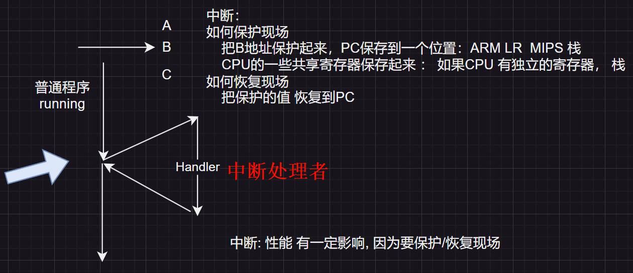 PC(程序计数器)保存在一个已知的位置: 当中断发生时, 程序计数器的值会被自动保存到一个预先定义且已知的内存位置或寄存器中。这样, 在中断处理完毕后, 系统可以轻松地恢复程序的执行点。