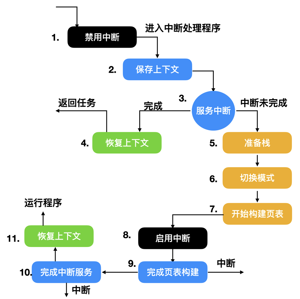 现代操作系统中, 一般不允许中断未完成(也就是需要长时间占用来完成中断任务), 如Linux会给这些 长中断 分配给一个内核线程, 然后马上回复上下文, 让新来的内核线程与用户进程争抢cpu调度.