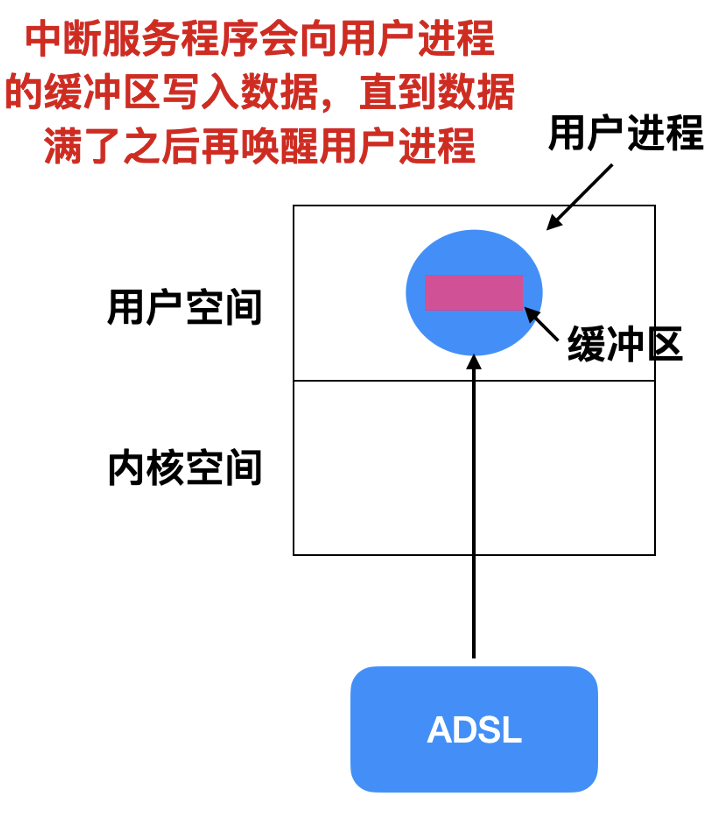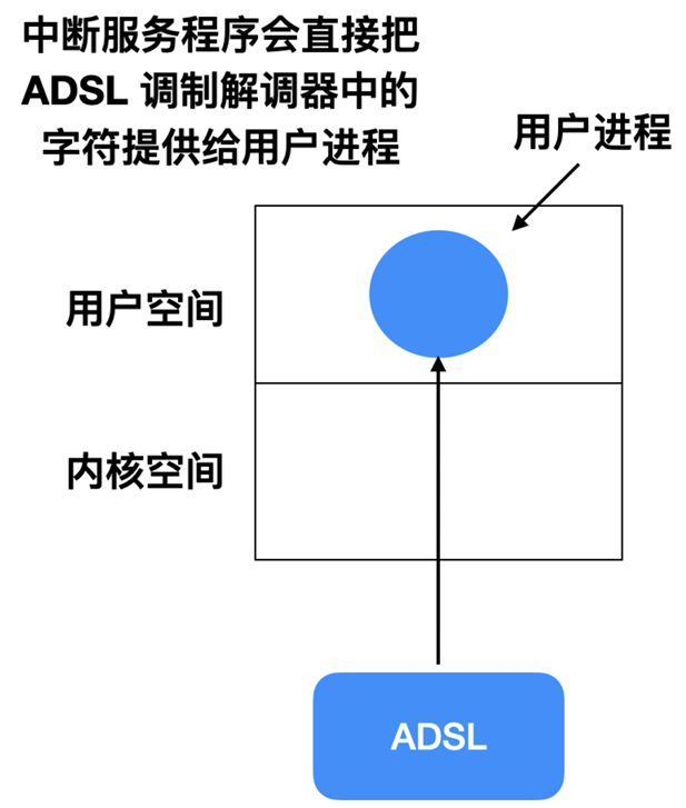 每当有新的字符通过ADSL到达时, 都会产生一个中断信号。中断服务程序(ISR)会负责响应这个中断, 并从ADSL设备中读取字符数据。随后, ISR会将这个字符数据传递给等待中的用户进程, 并解除其阻塞状态。这样, 用户进程就可以继续执行, 并对接收到的字符数据进行处理。