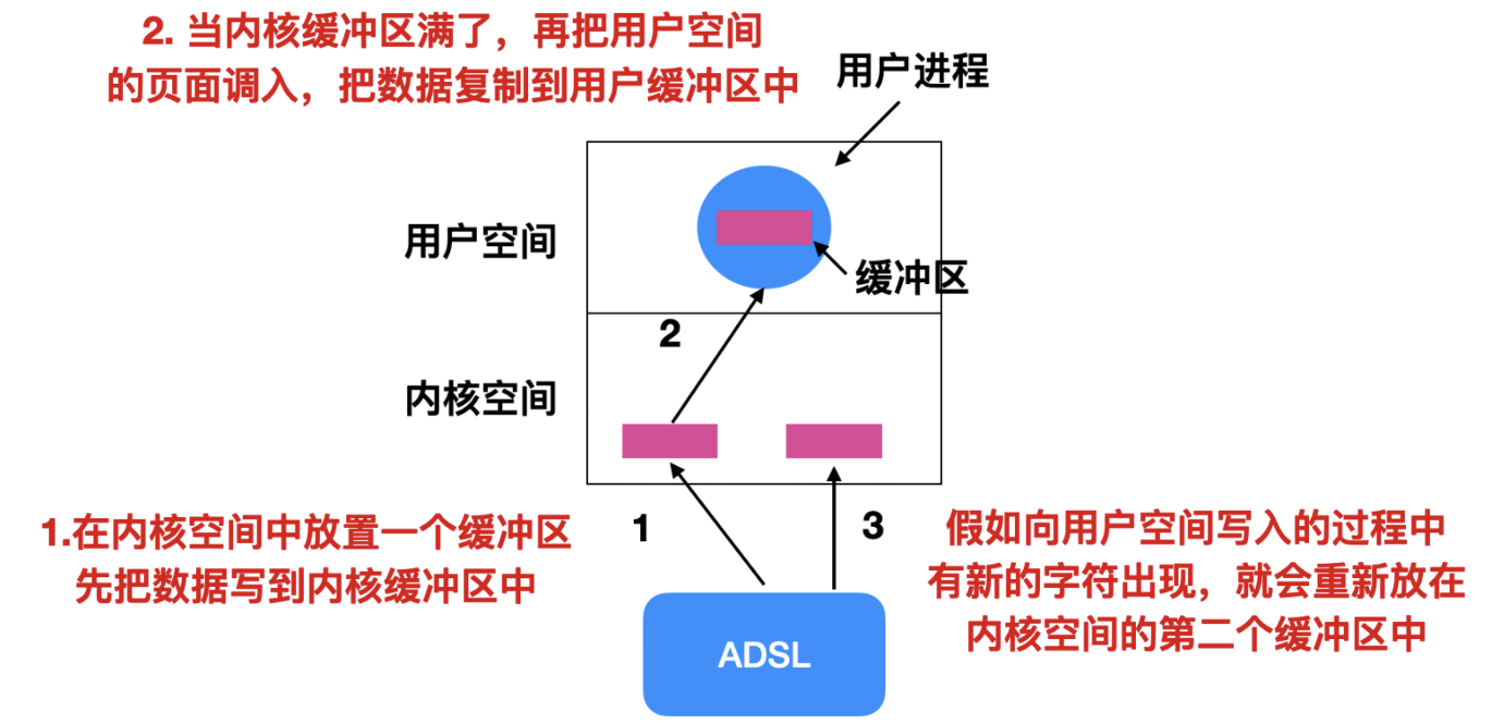 当用户程序需要通过ADSL接收数据时, 它会发起一个read系统调用。这个系统调用会导致用户进程进入阻塞状态, 等待字符数据的到来。这种等待机制是处理字符输入的一种常见方式。
