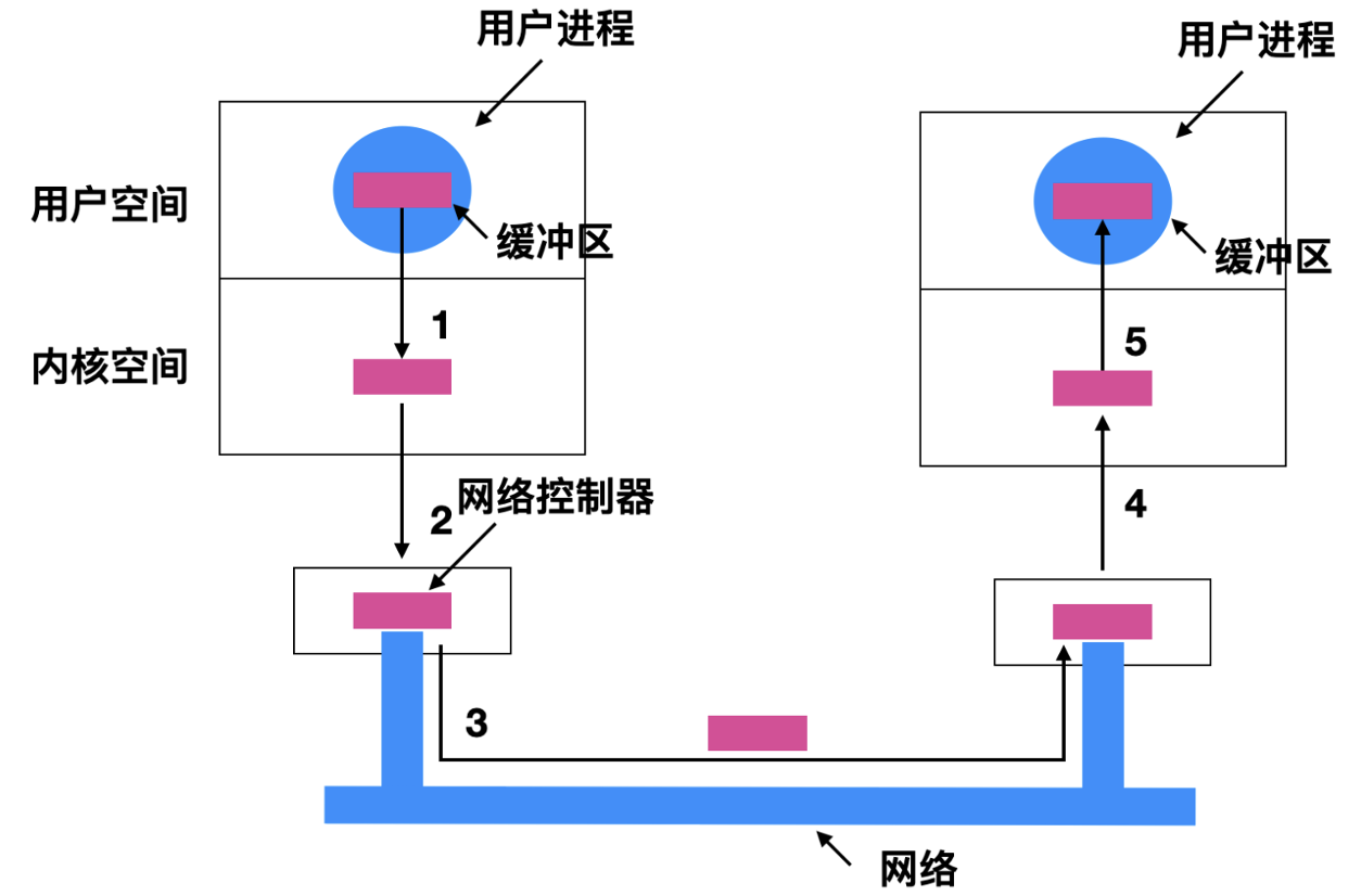 数据经过用户进程 -> 内核空间 -> 网络控制器, 这里的网络控制器应该就相当于是 socket 缓冲区, 然后发送到网络上, 再到接收方的网络控制器 -> 接收方的内核缓冲 -> 接收方的用户缓冲, 一条数据包被缓存了太多次, 很容易降低性能。