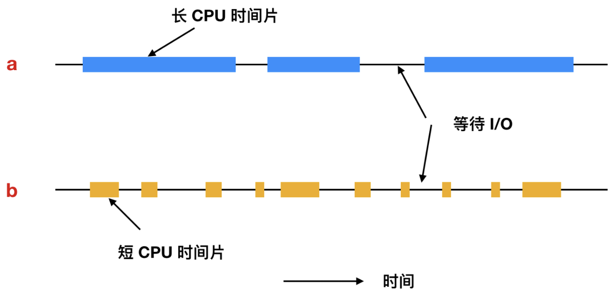 上面 a 是 CPU 密集型进程; b 是 I/O 密集型进程进程, a 因为在计算的时间上花费时间更长, 因此称为计算密集型(compute-bound)或者CPU 密集型(CPU-bound), b 因为I/O 发生频率比较快因此称为I/O 密集型(I/O-bound)。计算密集型进程有较长的 CPU 集中使用和较小频度的 I/O 等待。I/O 密集型进程有较短的 CPU 使用时间和较频繁的 I/O 等待。注意到上面两种进程的区分关键在于 CPU 的时间占用而不是 I/O 的时间占用。I/O 密集型的原因是因为它们没有在 I/O 之间花费更多的计算、而不是 I/O 请求时间特别长。无论数据到达后需要花费多少时间, 它们都需要花费相同的时间来发出读取磁盘块的硬件请求。
