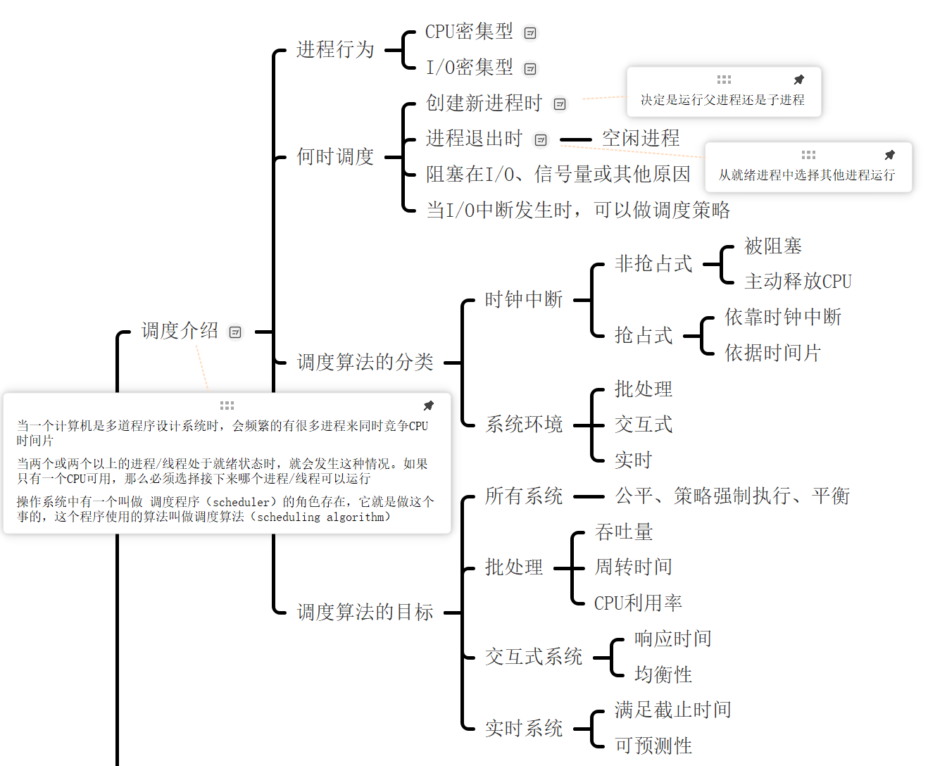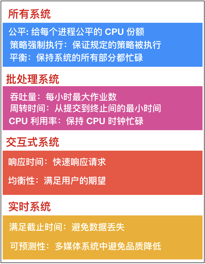 不同的调度算法有不同的设计目标和适用场景, 操作系统的调度策略需要根据应用环境的需求进行合理选择和调整。