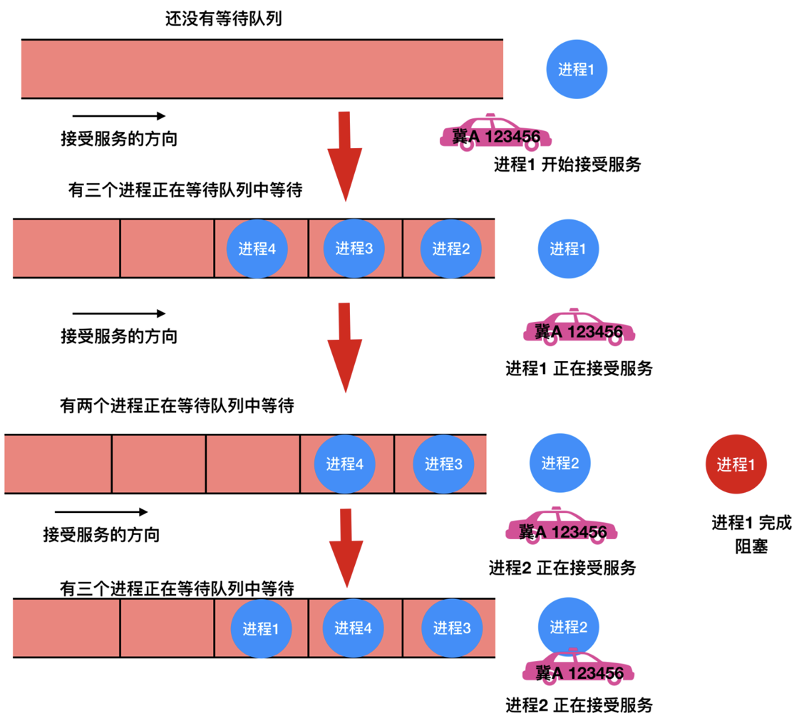 当正在运行的进程(如进程A)因为某种原因(如等待I/O操作完成)而进入阻塞状态时, 系统会检查就绪队列, 并启动队列中的第一个进程(此时为进程B, 假设它是队列中唯一的等待进程)继续执行。若此时有多个进程处于就绪状态, 则只有队列头部的进程会被选中执行。