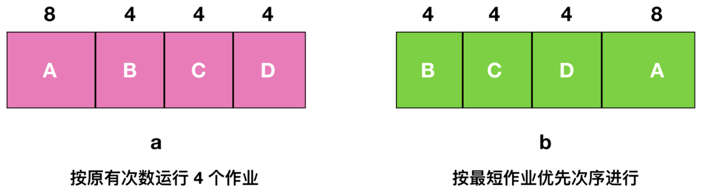 接下来, 我们考虑采用最短作业优先(SJF)算法来调度这四个作业, 如图b所示。在这种调度策略下, 作业按照其运行时间的短长顺序执行, 即首先执行运行时间最短的作业。因此, 作业B、C、D将先于作业A执行, 它们的周转时间分别为4分钟、8分钟和12分钟(考虑到前面的作业已占用时间), 而作业A则在最后执行, 周转时间为所有前面作业运行时间之和加上A自身的运行时间, 即20分钟。此时, 平均周转时间计算为 分钟。