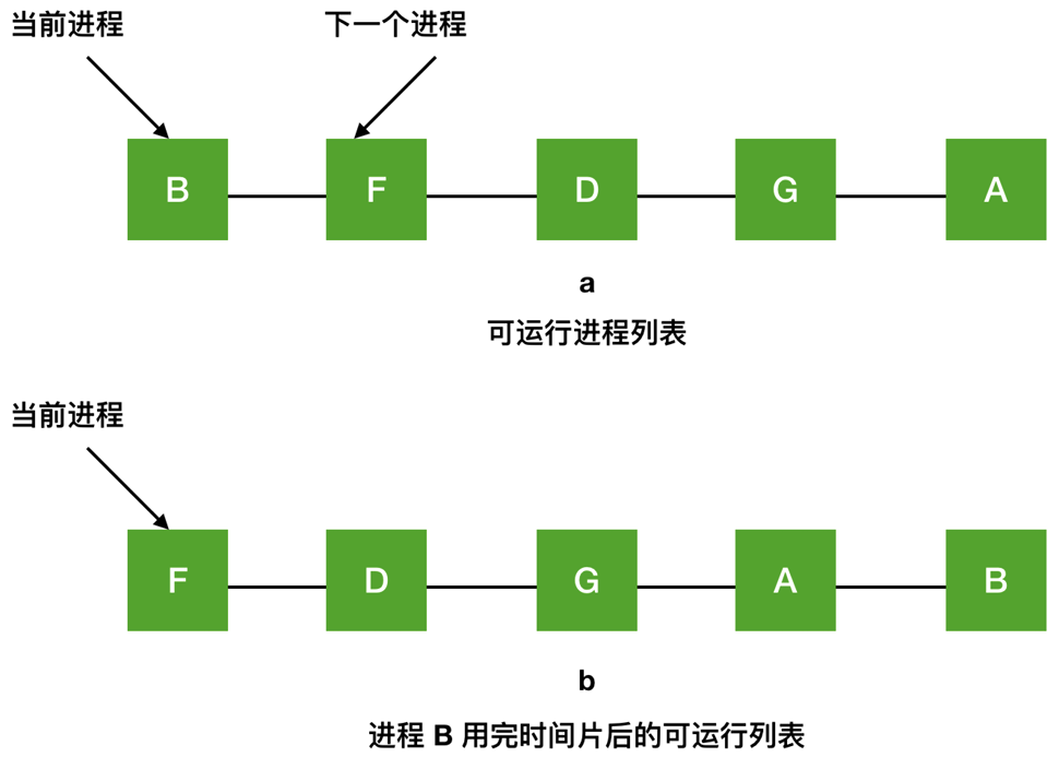 调度程序所做的就是维护一个可运行进程的列表, 就像下图中的 , 当一个进程用完时间片后就被移到队列的末尾, 就像下图的 。[双向循环链表]