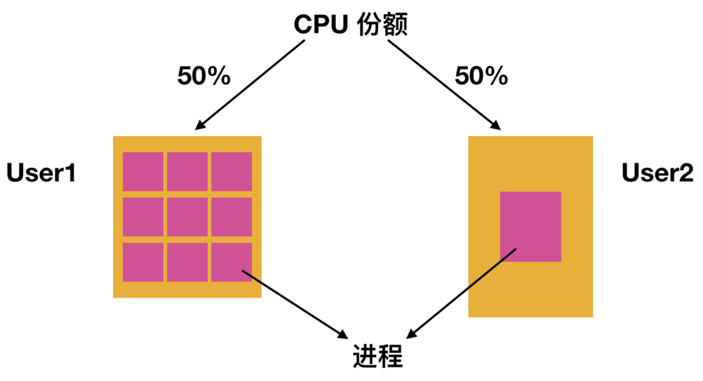 为了阻止这种情况的出现, 一些系统在调度前会把进程的拥有者考虑在内。在这种模型下, 每个用户都会分配一些CPU 时间, 而调度程序会选择进程并强制执行。因此如果两个用户每个都会有 50% 的 CPU 时间片保证, 那么无论一个用户有多少个进程, 都将获得相同的 CPU 份额。