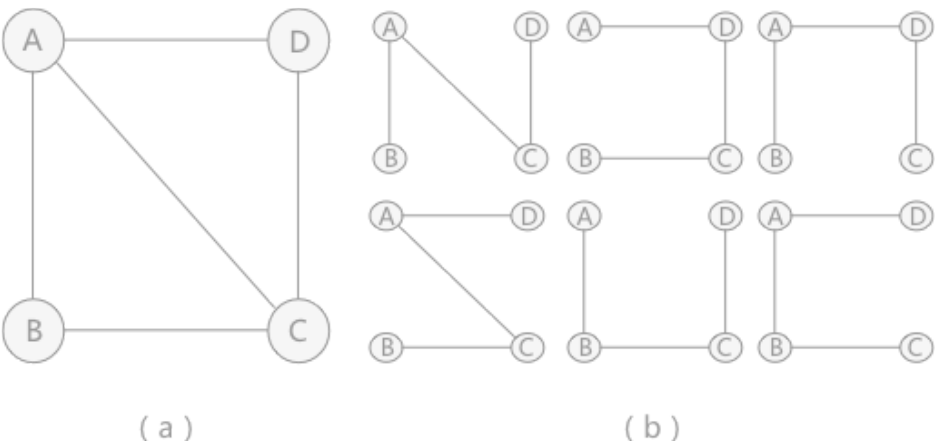 连通图和它相对应的生成树,可以用于解决实际生活中的问题:假设A、B、C 和 D为 4 座城市,为了方便生产生活,要为这4 座城市建立通信。对于4个城市来讲,本着节约经费的原则,只需要建立3个通信线路即可,就如图(b)中的任意一种方式。
