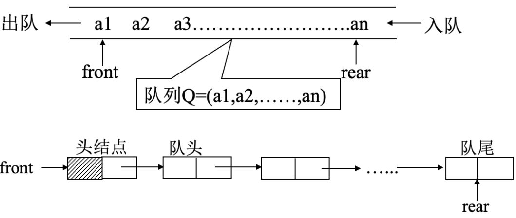 • 因为队列只允许在一端插入,在另一端删除,所以只有最早进入的队列元素才可以从队列中删除,故队列又称为先进先出线性表。