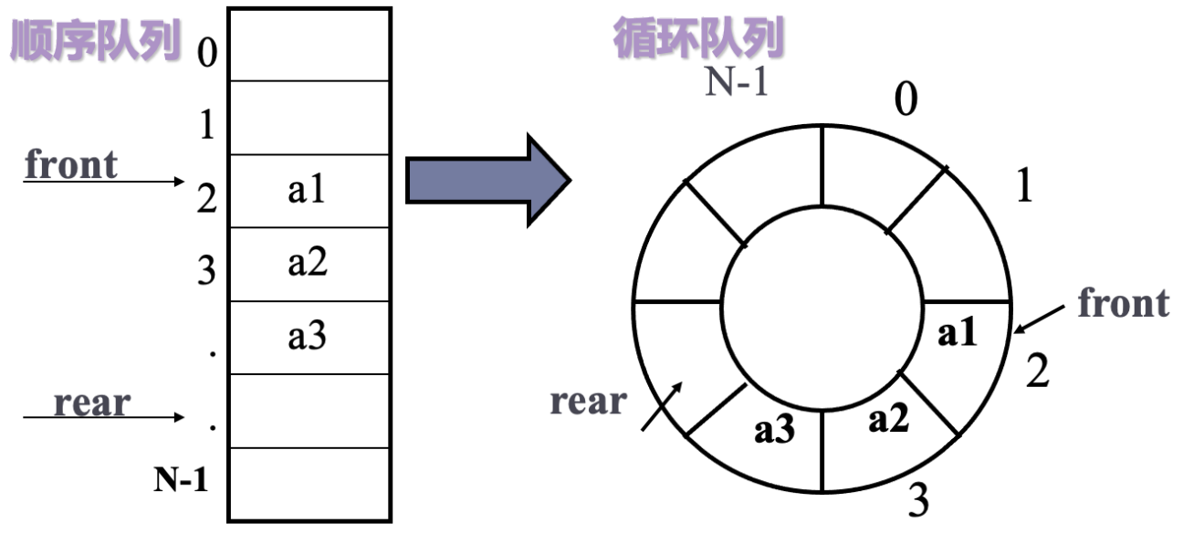 • 为了解决假溢出的问题,就是将我们的顺序队列看成是首尾相接的循环结构。首尾指示器不变,这种队列就叫做,循环顺序队列