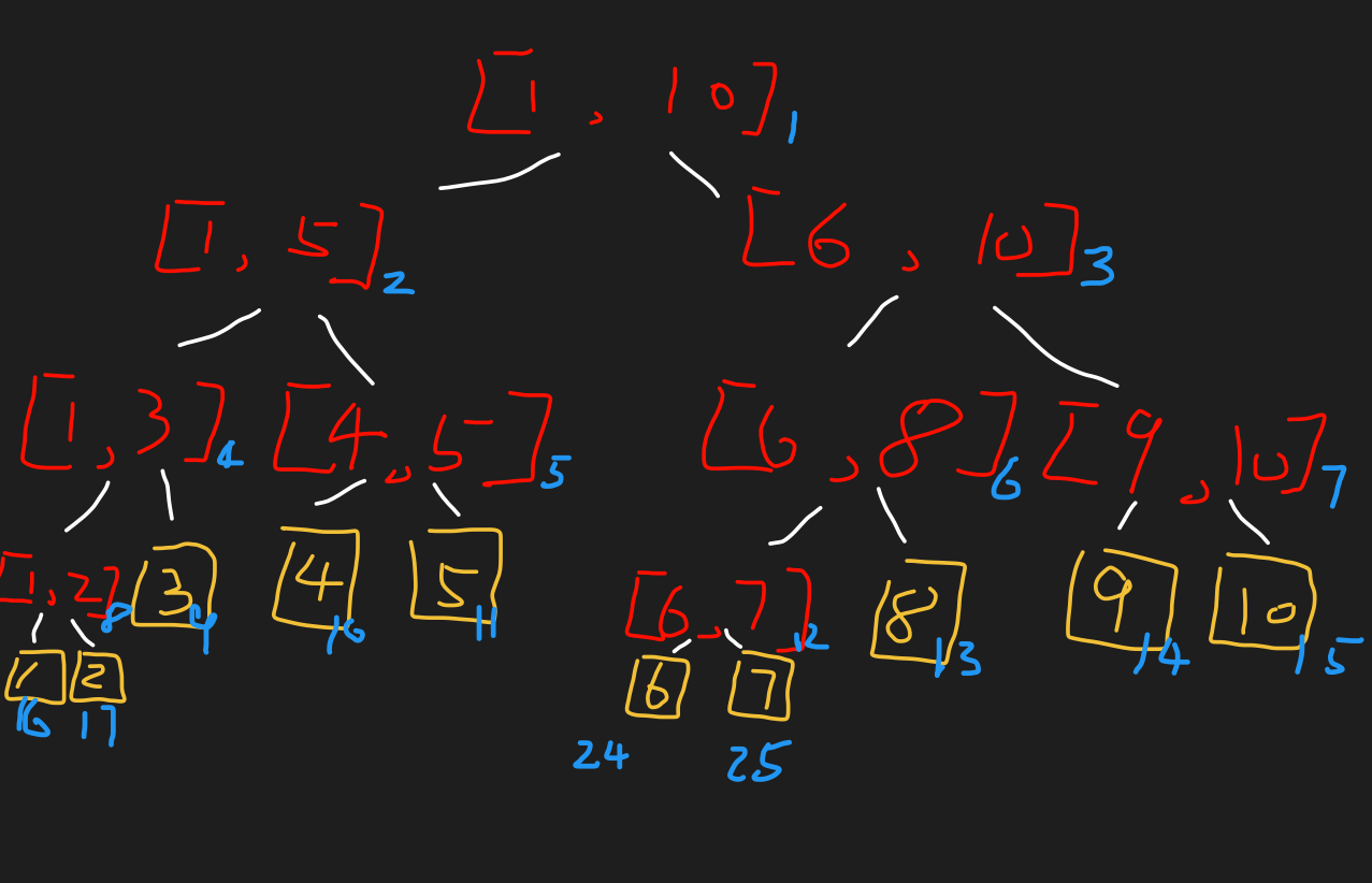 tree[1]即树的根结点, 表示的是 [1, 10] 这个区间的和 tree[1]的 左子树tree[1 * 2]则代表 [1, (1 + 10) / 2] 这个区间的和tree[1]的 右子树tree[1 * 2 + 1]则代表 [(1 + 10) / 2 + 1, 10] 这个区间的和- 以此类推