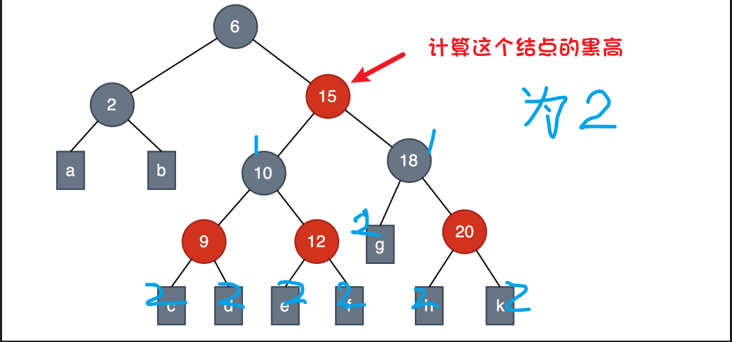 例如下图的节点6的黑高和红色节点15的黑高是一样的,都是2。