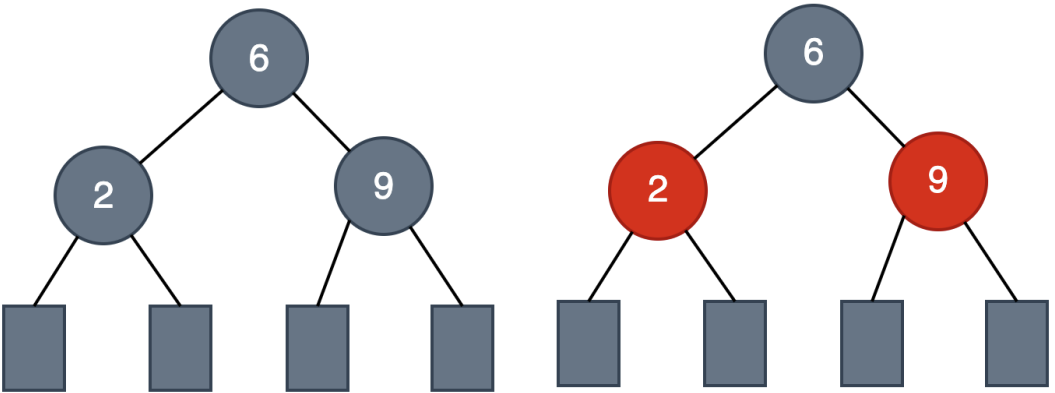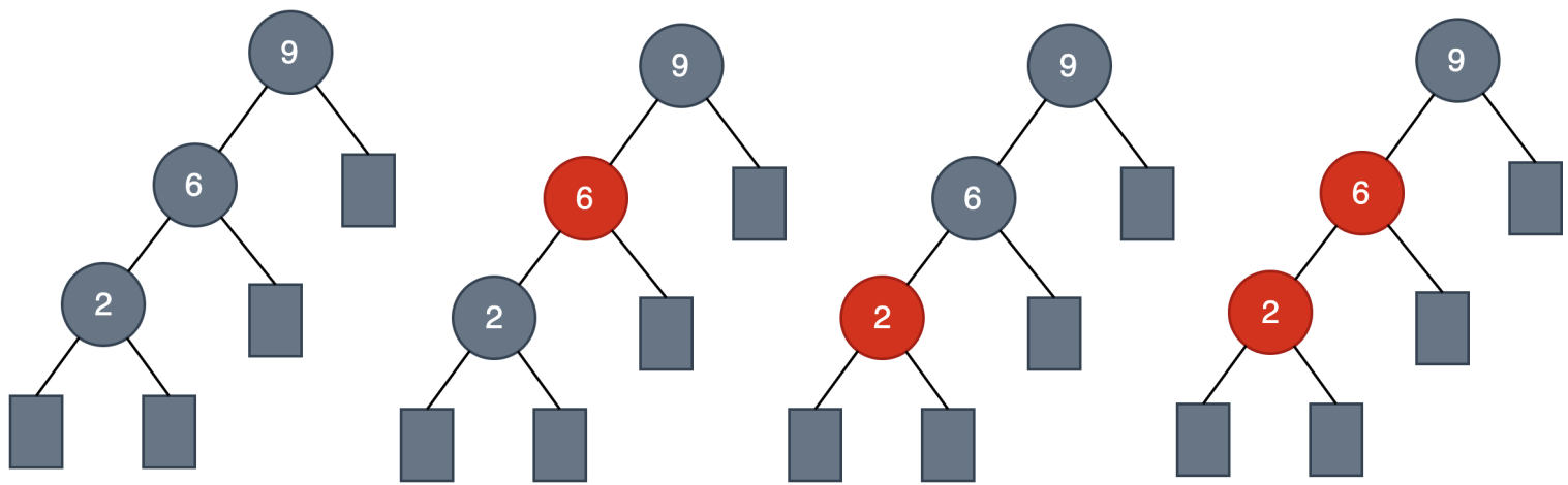 将根结点9涂黑色,其他结点分四种情况着色,结果都不满足红黑树的性质要求。唯一的办法就是调整树的高度和染色。