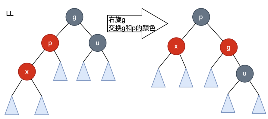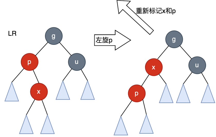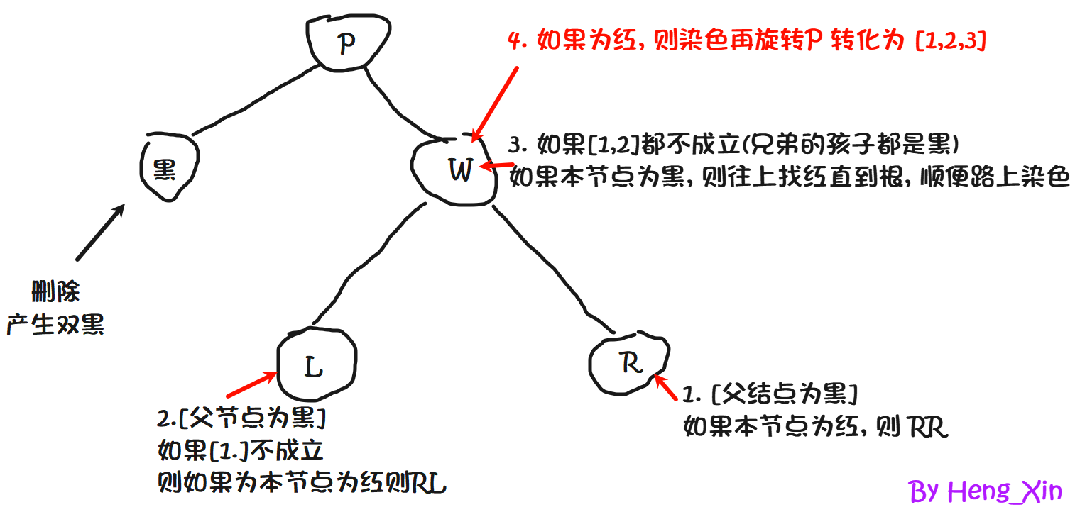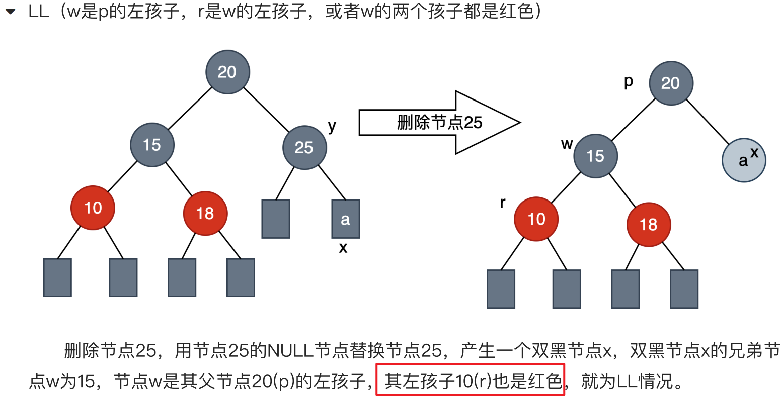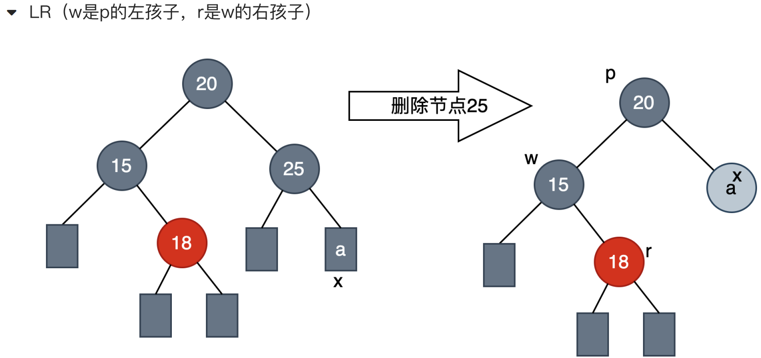 - LR -->LL的方法:w的右孩子变为黑色,w变为红色,以w为节点进行左旋。