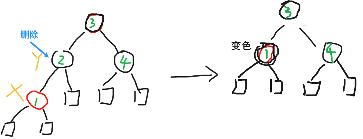 如果x或者y是红色,我们将替换结点y的结点x标记为黑色结点(这样黑高就不会变化)。