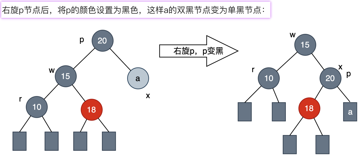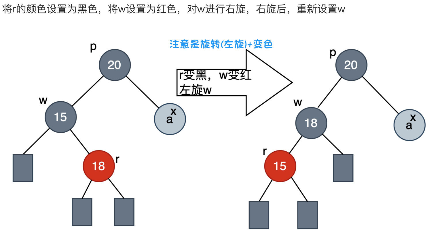 对于这种情况,需要对x的兄弟节点w进行旋转操作,将w的一个红色节点用r表示,x和w的父节点用p表示。