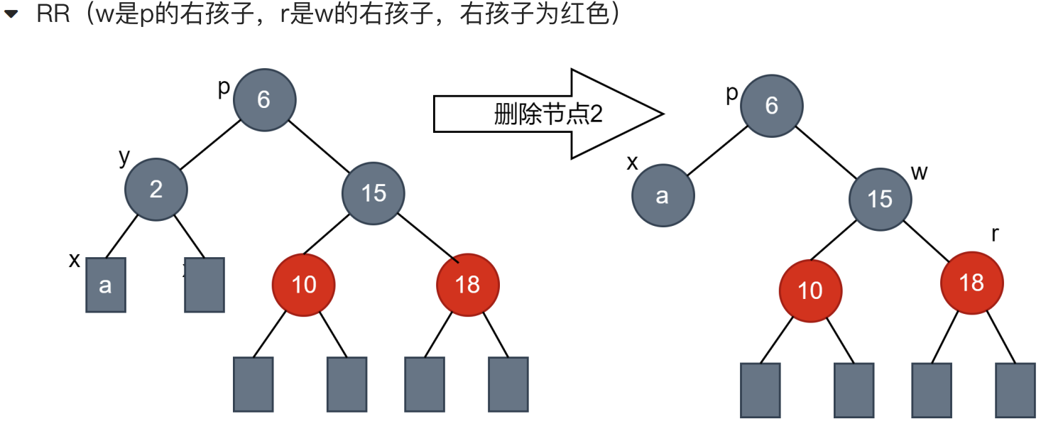 (3)RR的调整方法,r节点(w的右孩子)变为黑色,w节点变为父节点颜色,父节点变为黑色,左旋父节点