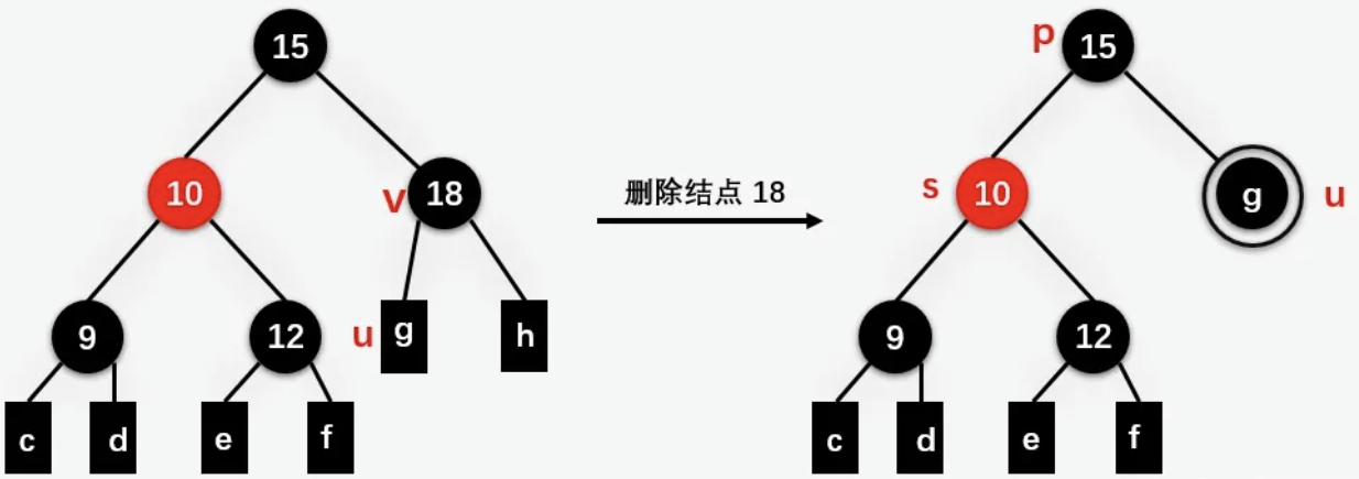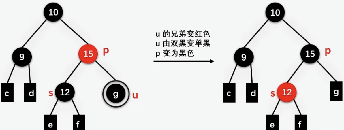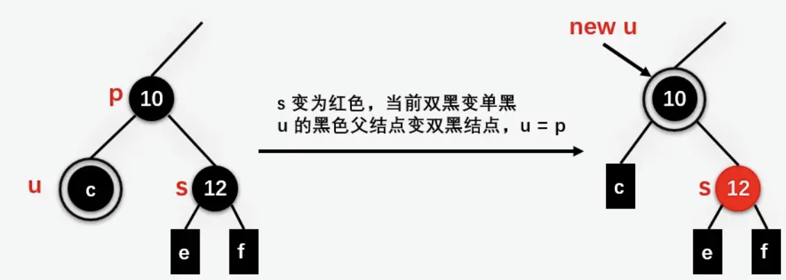 对于这种情况需要递归地进行处理,如果删除结点后得到的双黑结点的父结点此时为黑色,则结点 u 变单黑,且结点 u 的父结点 p 变双黑,然后对结点 u 的父结点 p 继续进行处理,直到当前处理的双黑结点的父结点为红色结点,此时将双黑结点的父结点设置为黑色,双黑结点变为单黑结点 (红色 + 双黑 = 单黑)。