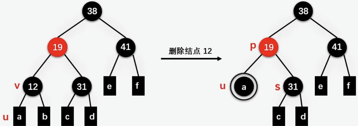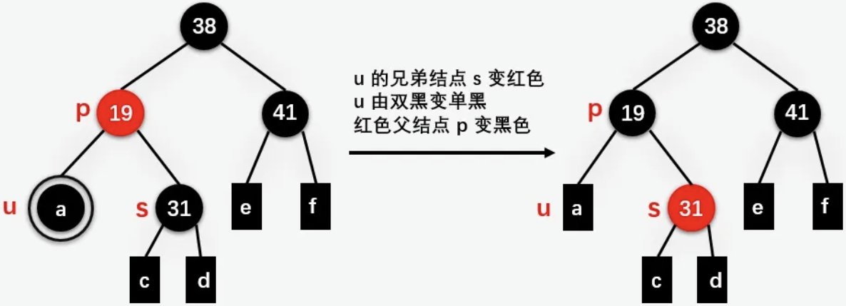 | 此时只需要将结点 u 的兄弟结点 31 的颜色变为红色,双黑结点 u 的父结点 19 由红色变为黑色结点,双黑结点 u 变为单黑结点。 |