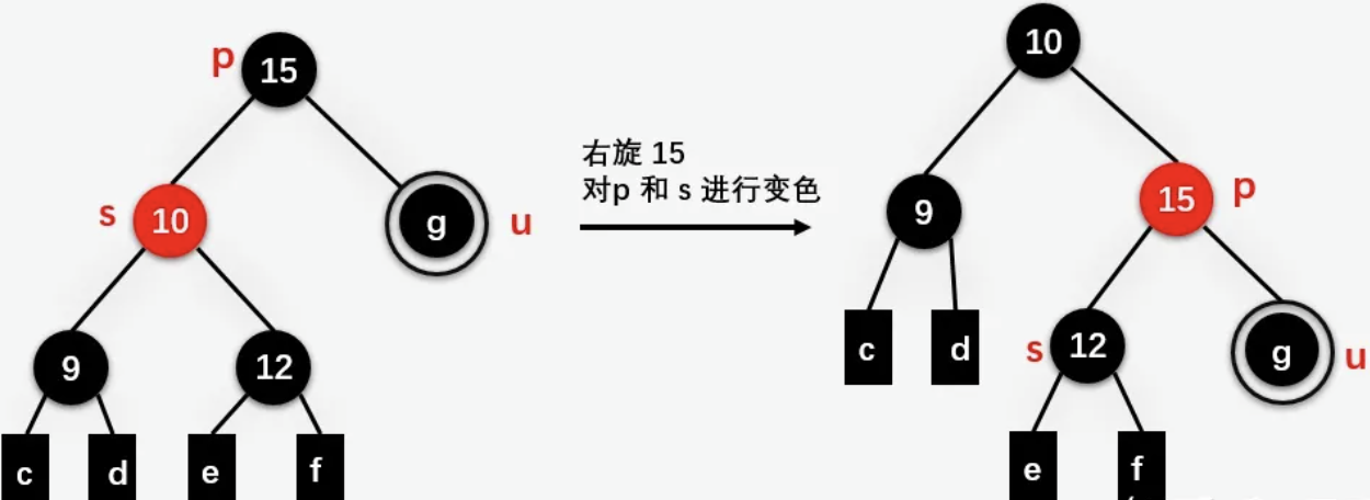 u 的兄弟结点 s 是父结点 p 的左孩子, 对结点 p 进行右旋操作