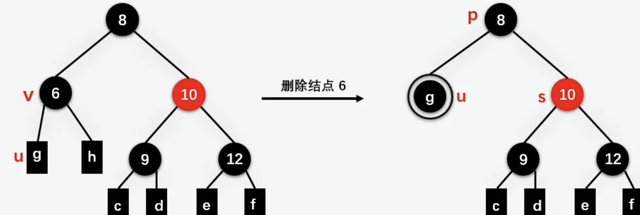 | 此时双黑结点的兄弟结点 12 变为红色结点,然后将 u 的父结点 10 变为双黑结点,一直向上判断。 |