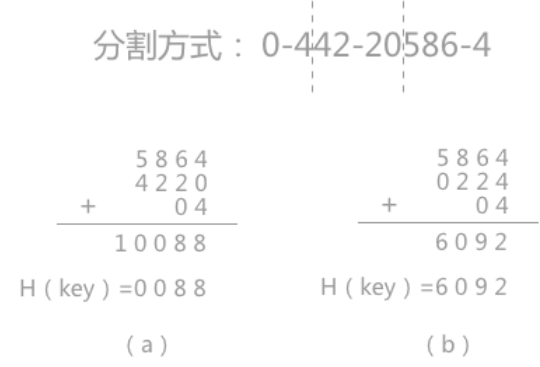 是将关键字分割成位数相同的几部分(最后一部分的位数可以不同),然后取这几部分的叠加和(舍去进位)作为哈希地址。此方法适合关键字位数较多的情况。